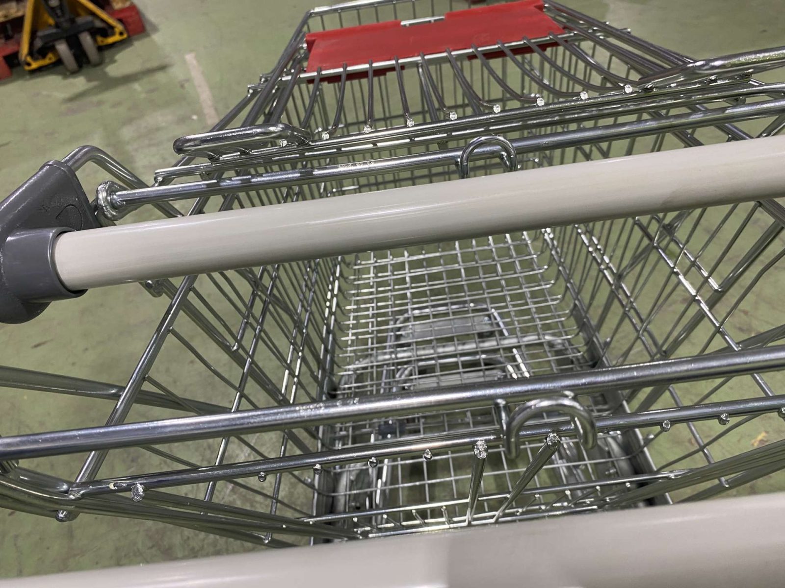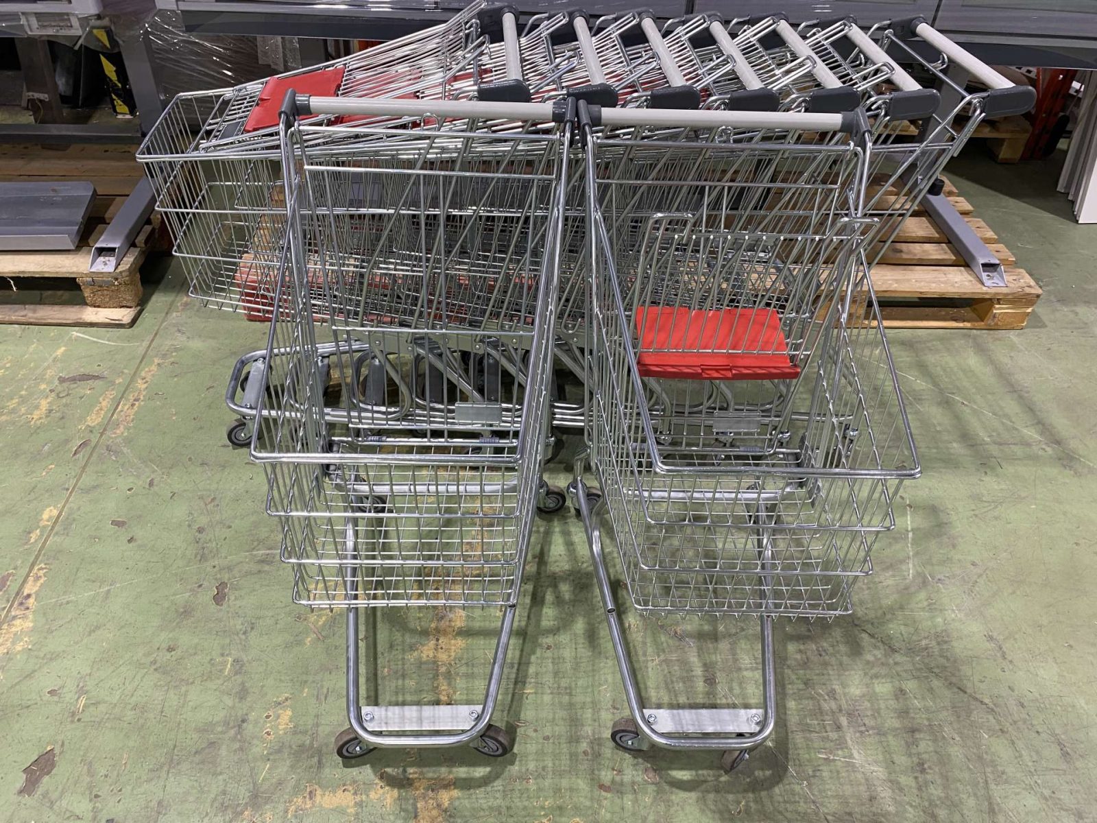 Felújított egyszínű szürke csőmarkolattal és szürke műanyagokkal szerelt horganyzott kocsik betétizár nélkül, gyereküléssel, vagy anélkül.