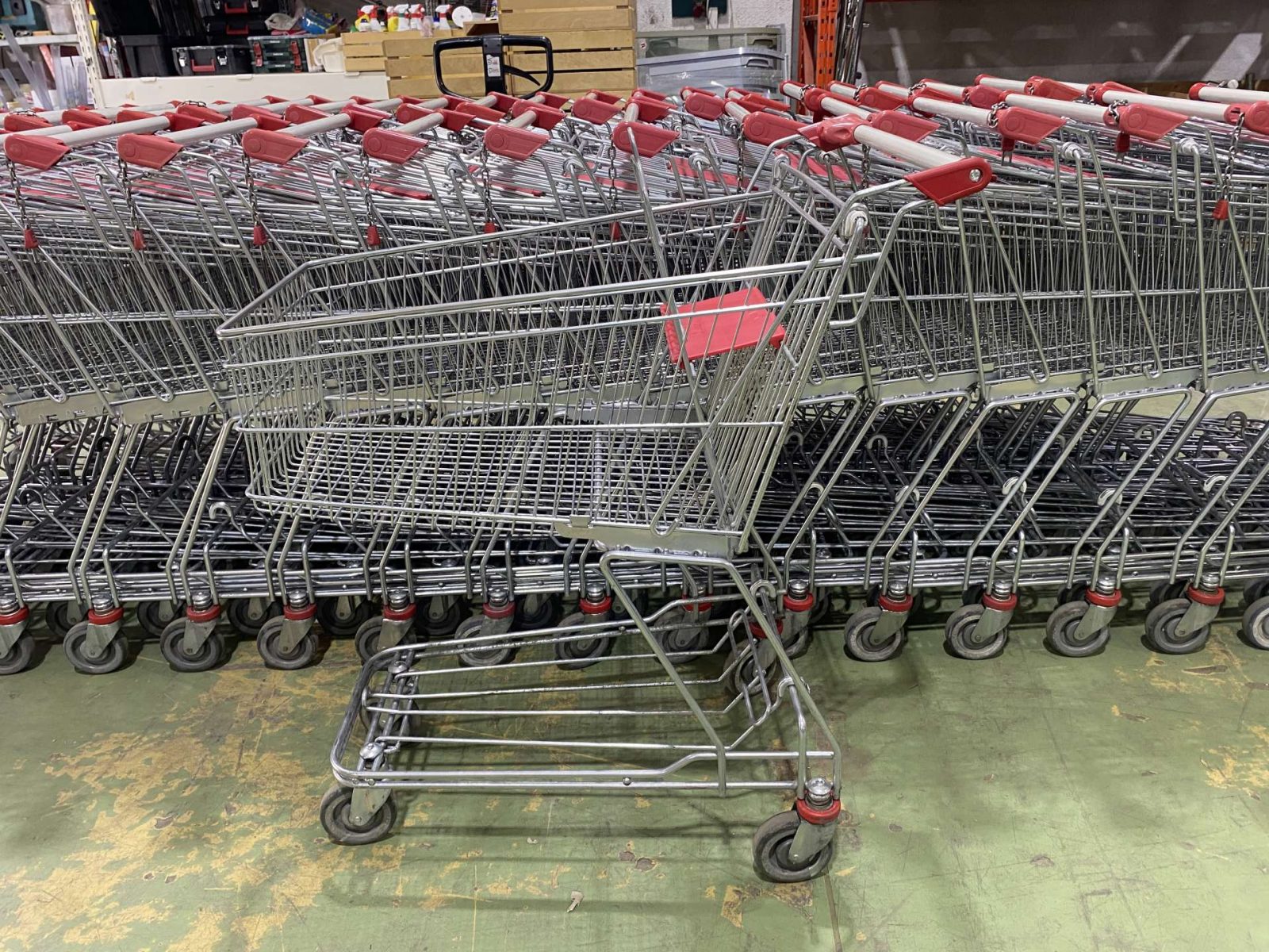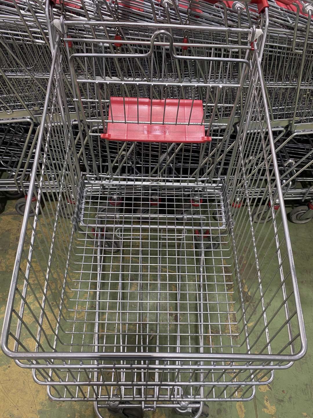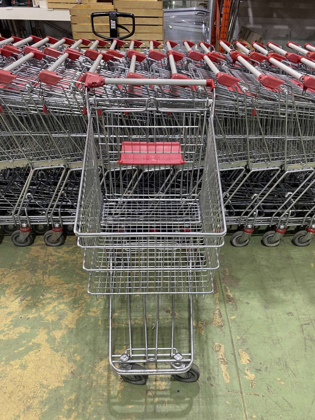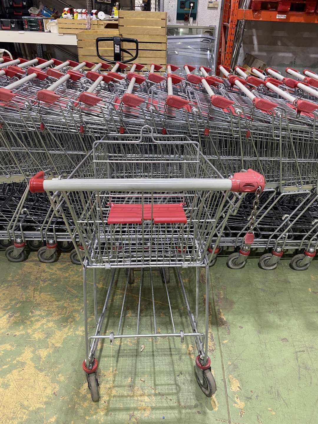 Szürke csőmarkolattal és piros műanyagokkal szerelt horganyzott kocsik betétizárral, gyereküléssel.