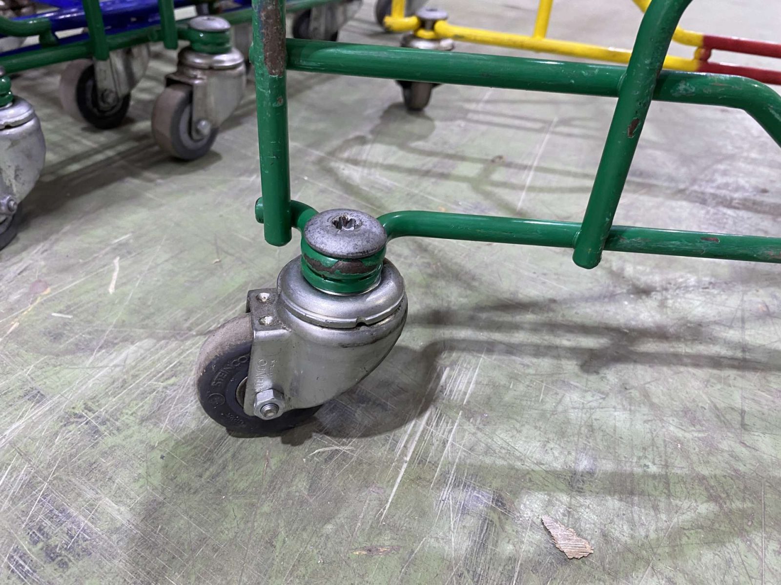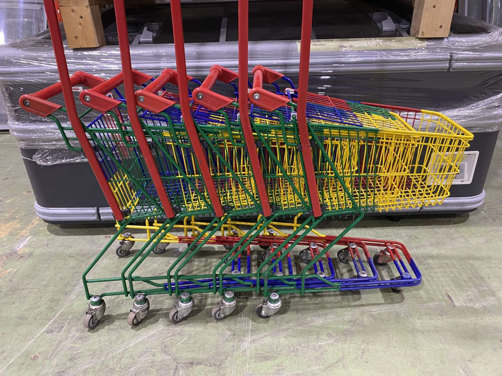 Szürke csőmarkolattal és piros műanyagokkal szerelt színterezett ("Harlequin") gyerek bevásárlókocsi.