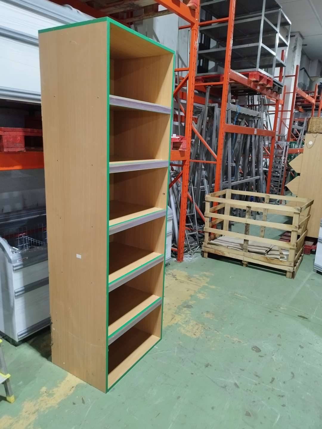 Egyedi gyártású tárolópolc, dekor bútorlapból, elsősorban az oszlopok által tagolt hűtőbútorok és polcsorok áthidalására.
