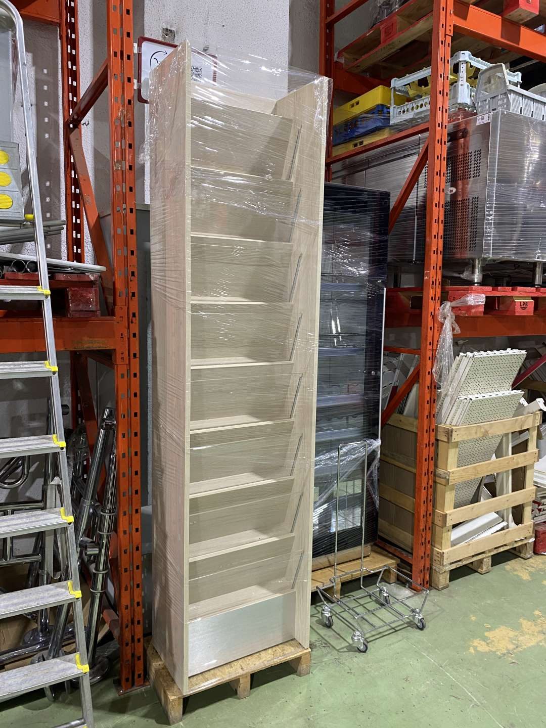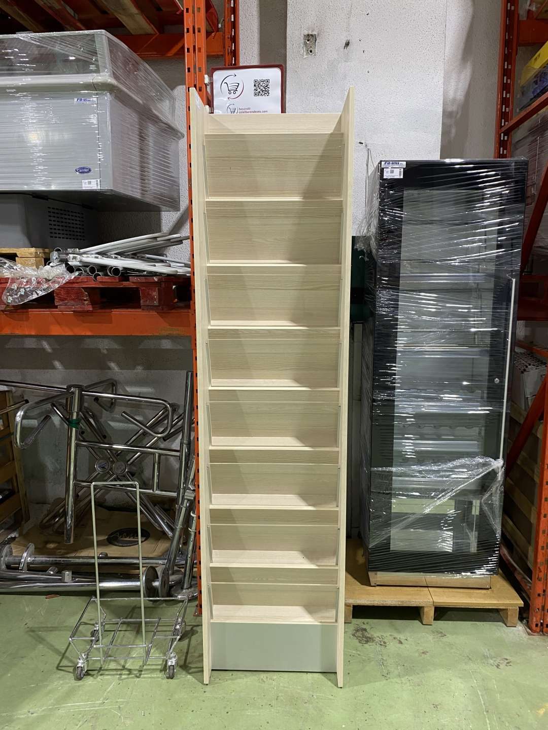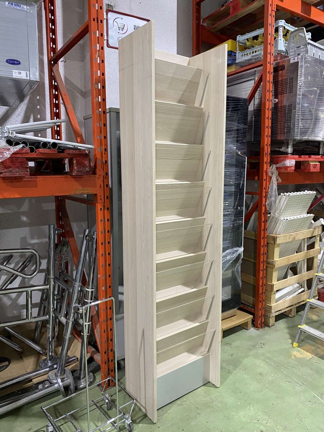 Újszágos állvány bútorlapból. 55*35*205 cm ( Szélesség*magasság*mélység) Padlóra, vagy faliállványra. 8 sorban helyezhetőek el rajta újságok, könyvek. Minden polc döntött és rendelkezik víztiszta plexi kidőlésgátlóval.