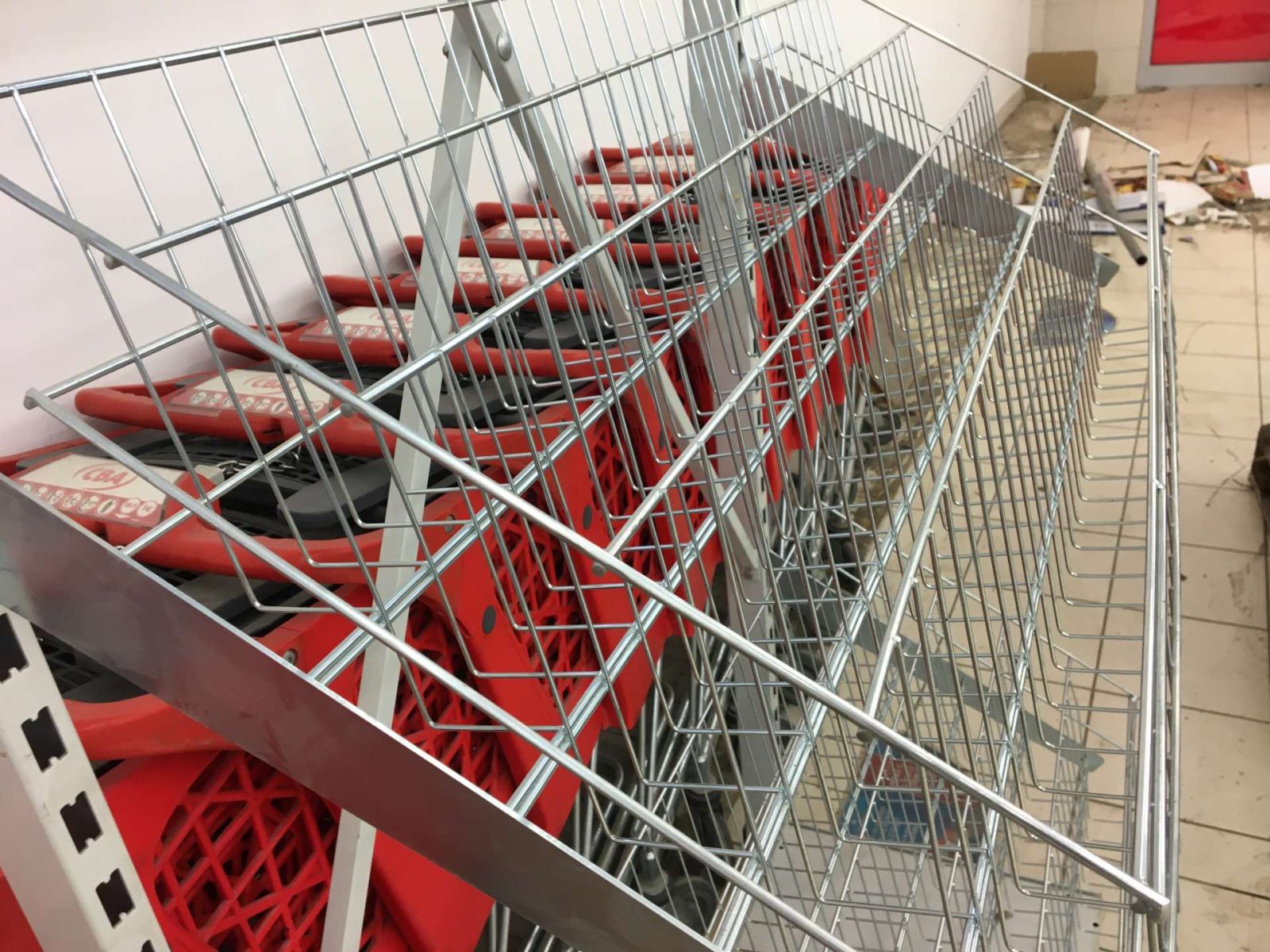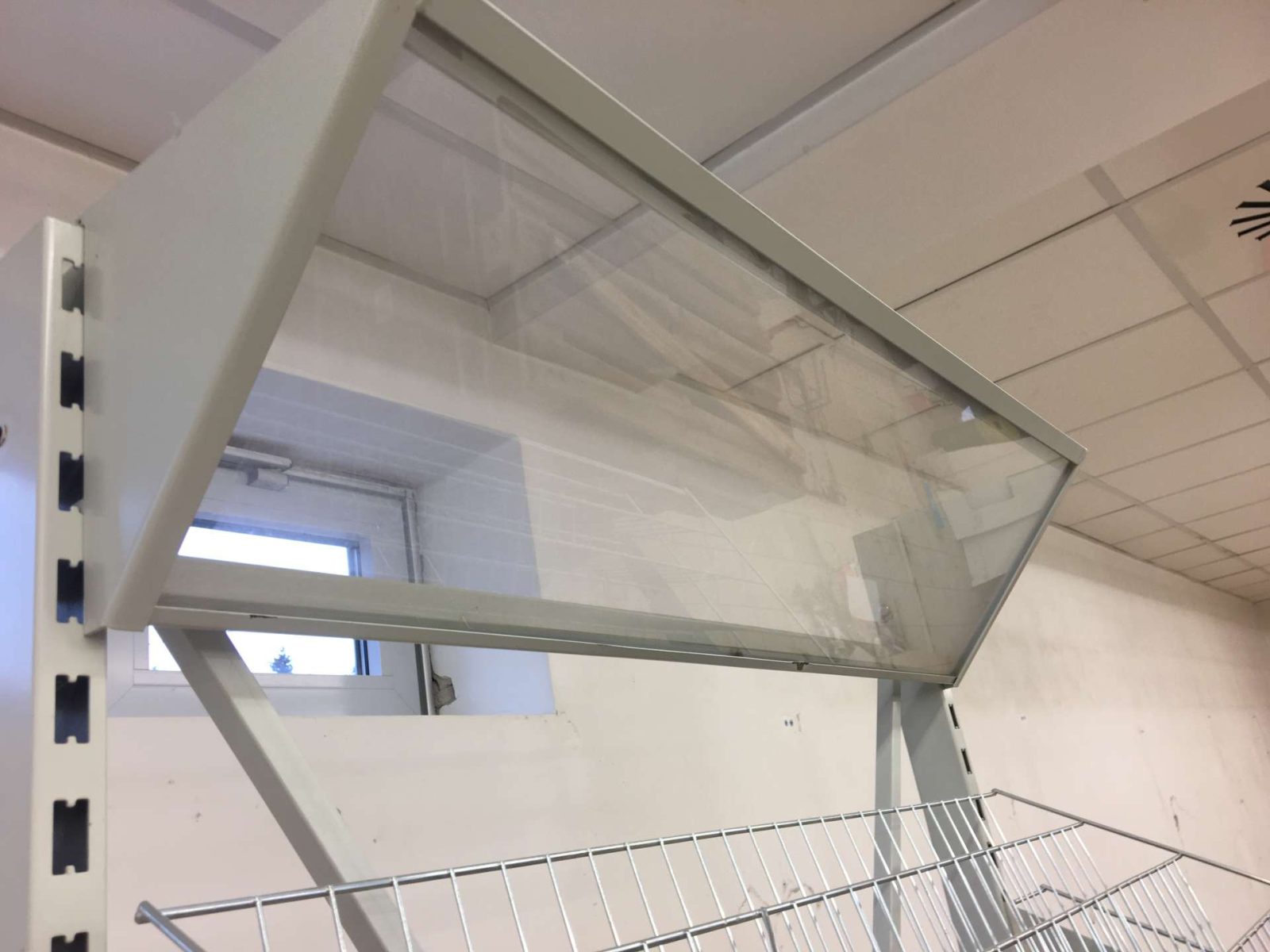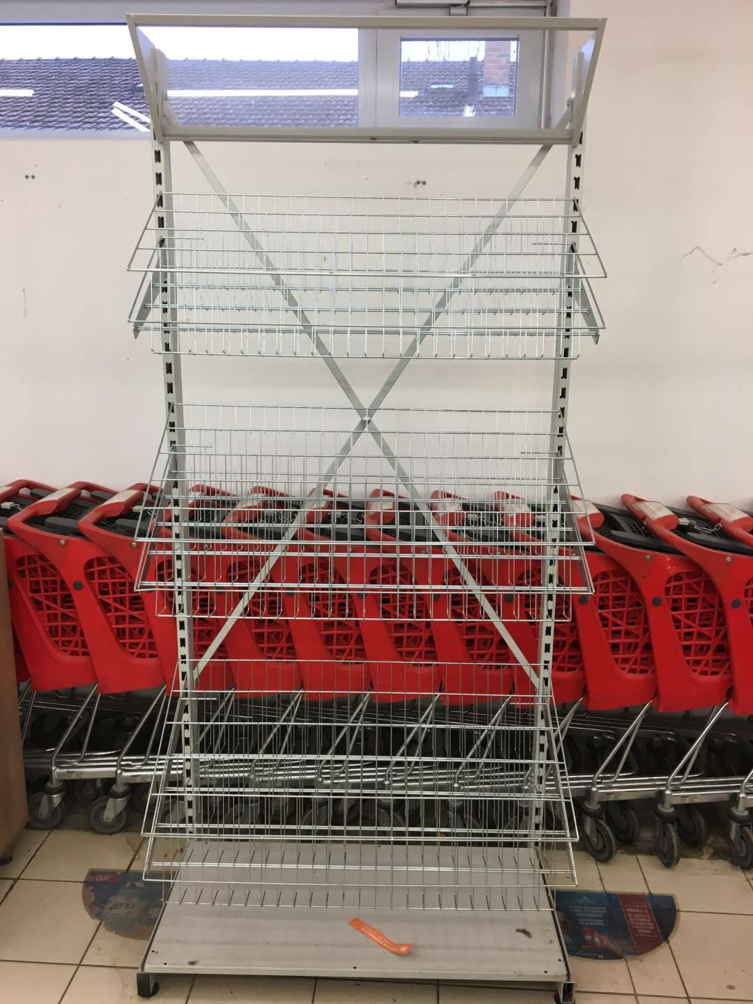 TEGO vázra szerelt újságos állvány. Alap + 3 sor döntött rácspolccal. Dekorálható felső döntött frízzel.