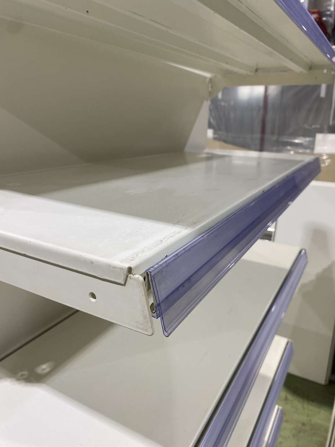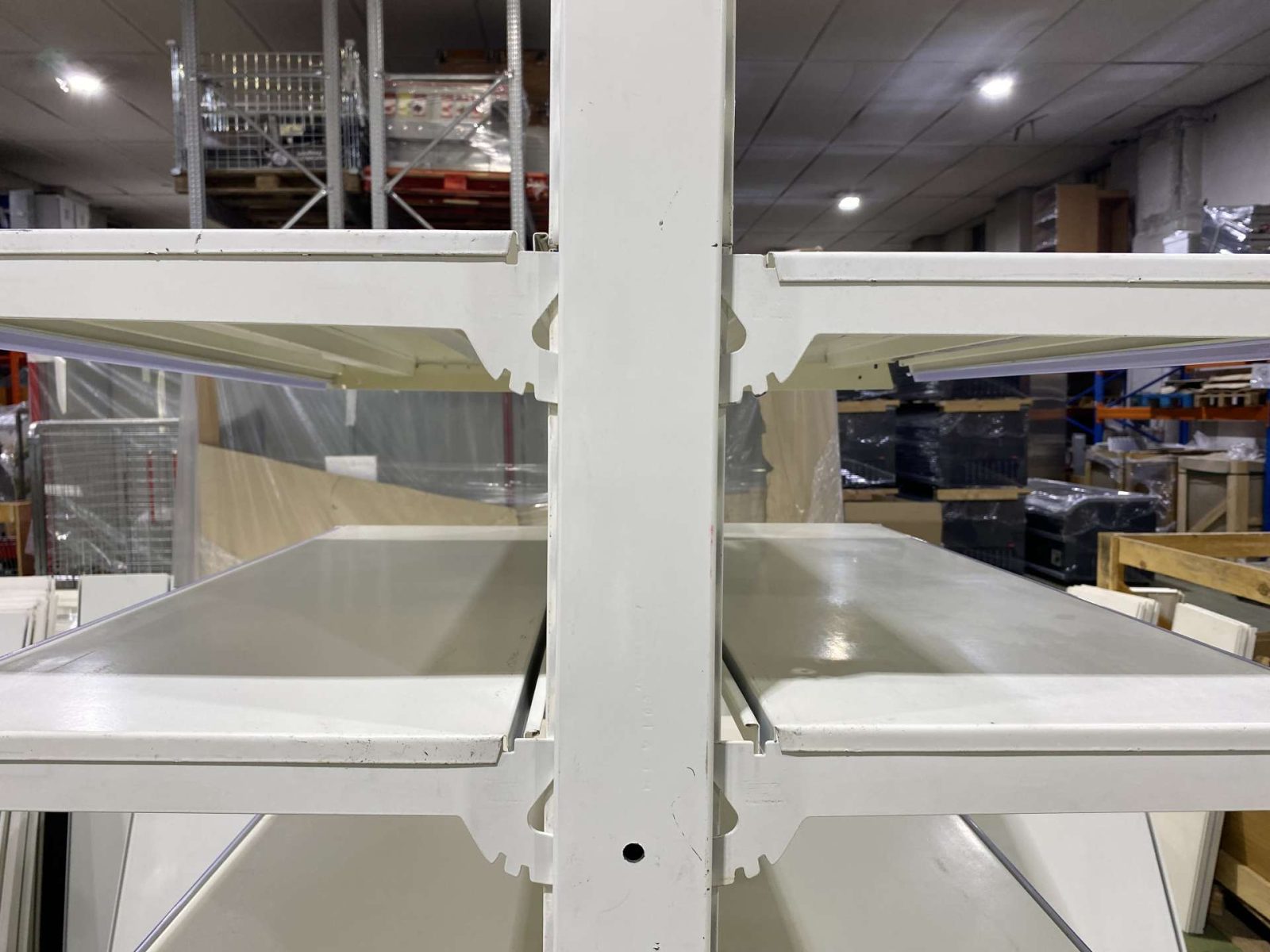 Tegometal, vagy azzal kompatibilis Eden, Mago fehér színű használt polcrendszer 66,5/100/125/133-as szélességben. Oszlopmagasság 140/185/210 cm.