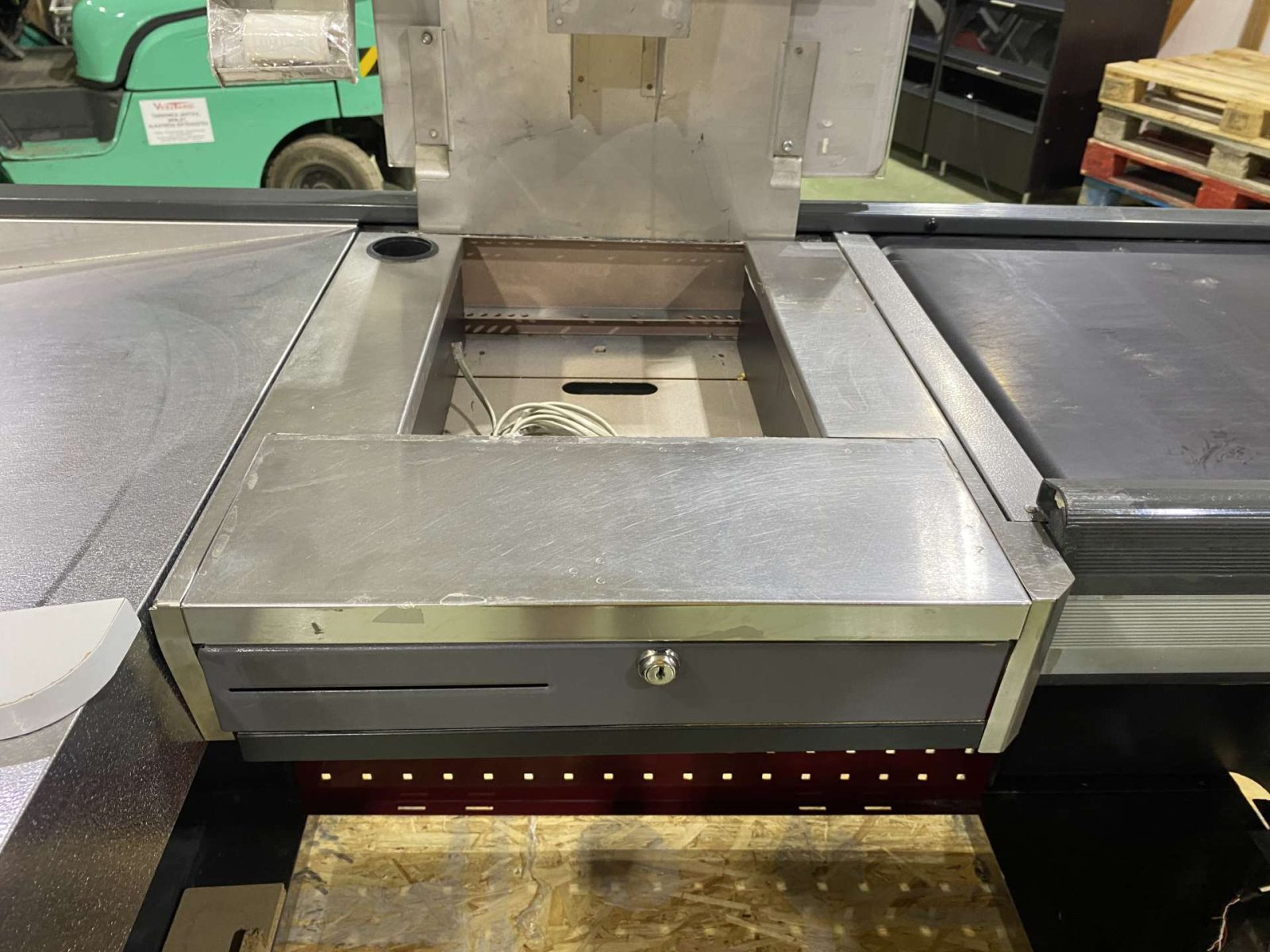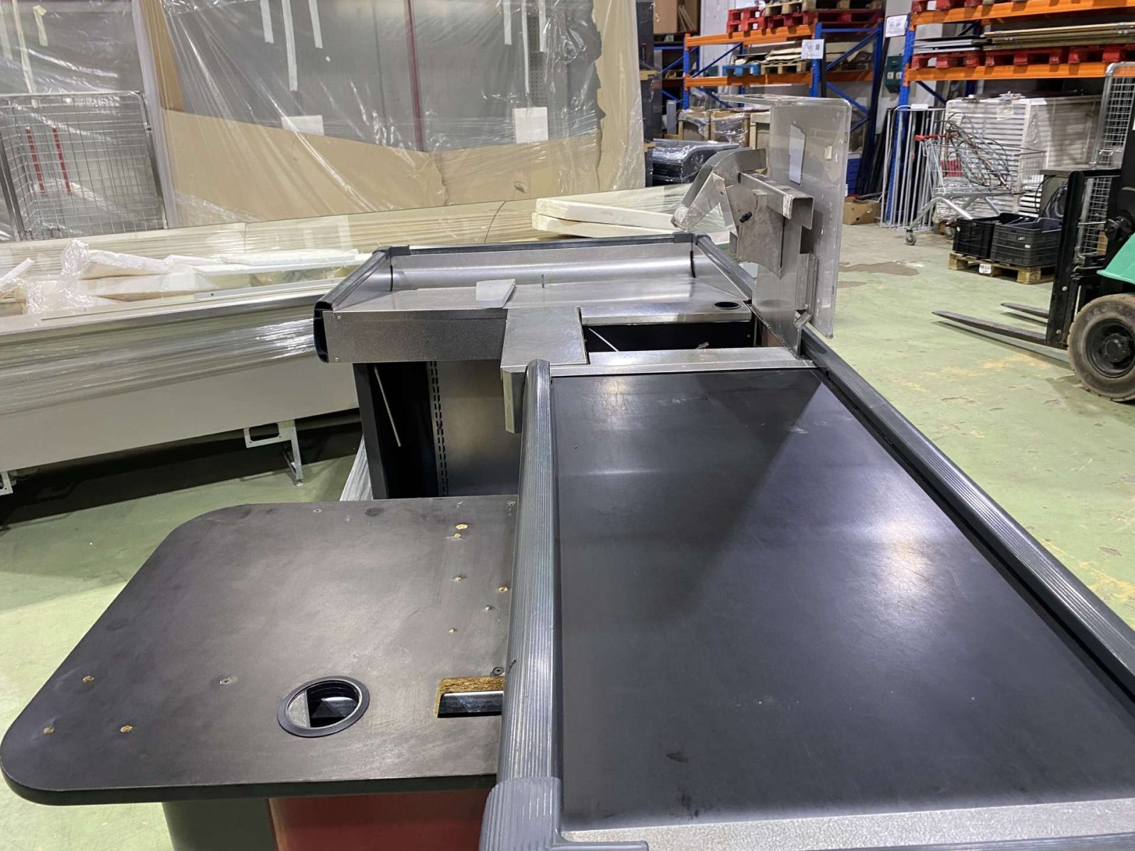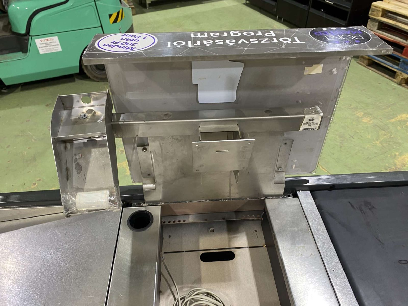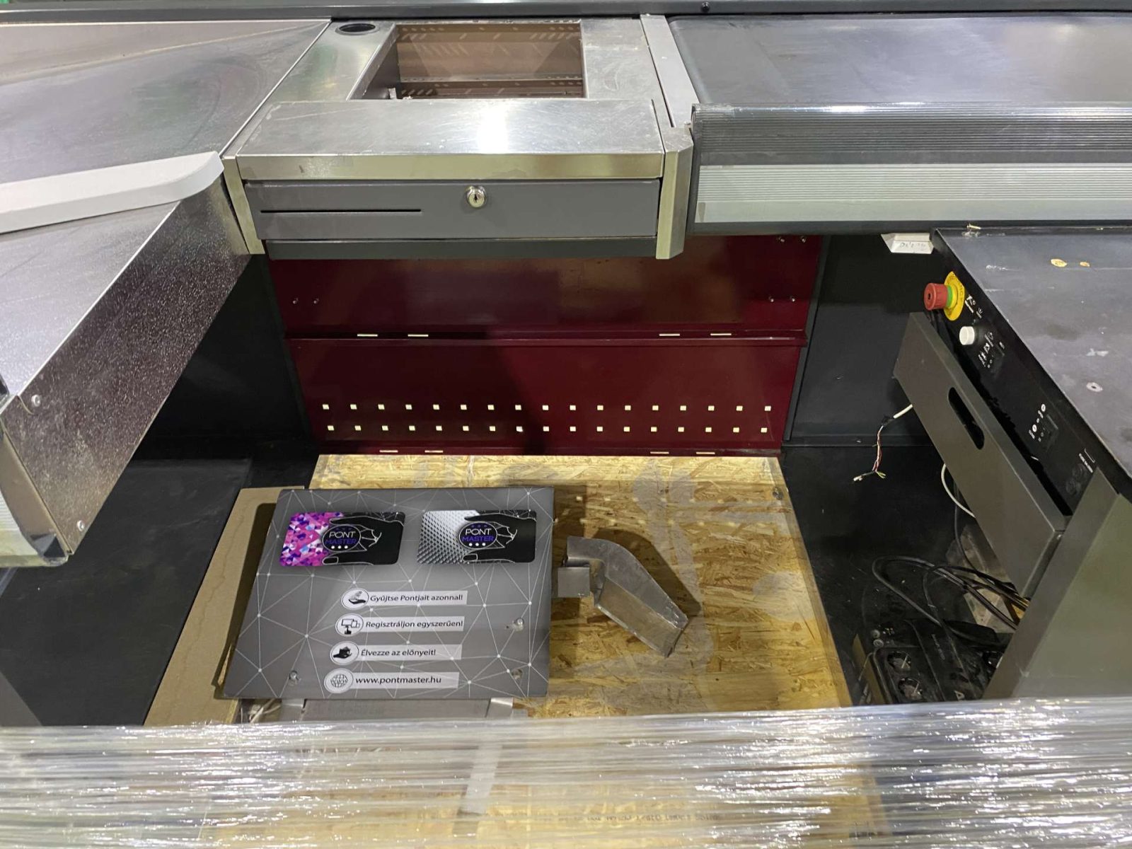 Dupla elpakolós, 260 cm hosszú, 85 cm-es szalag, süllyesztett kasszaszkenner elhelyezés, plexi, kasszazár, monitor,- és pinpadtartó.