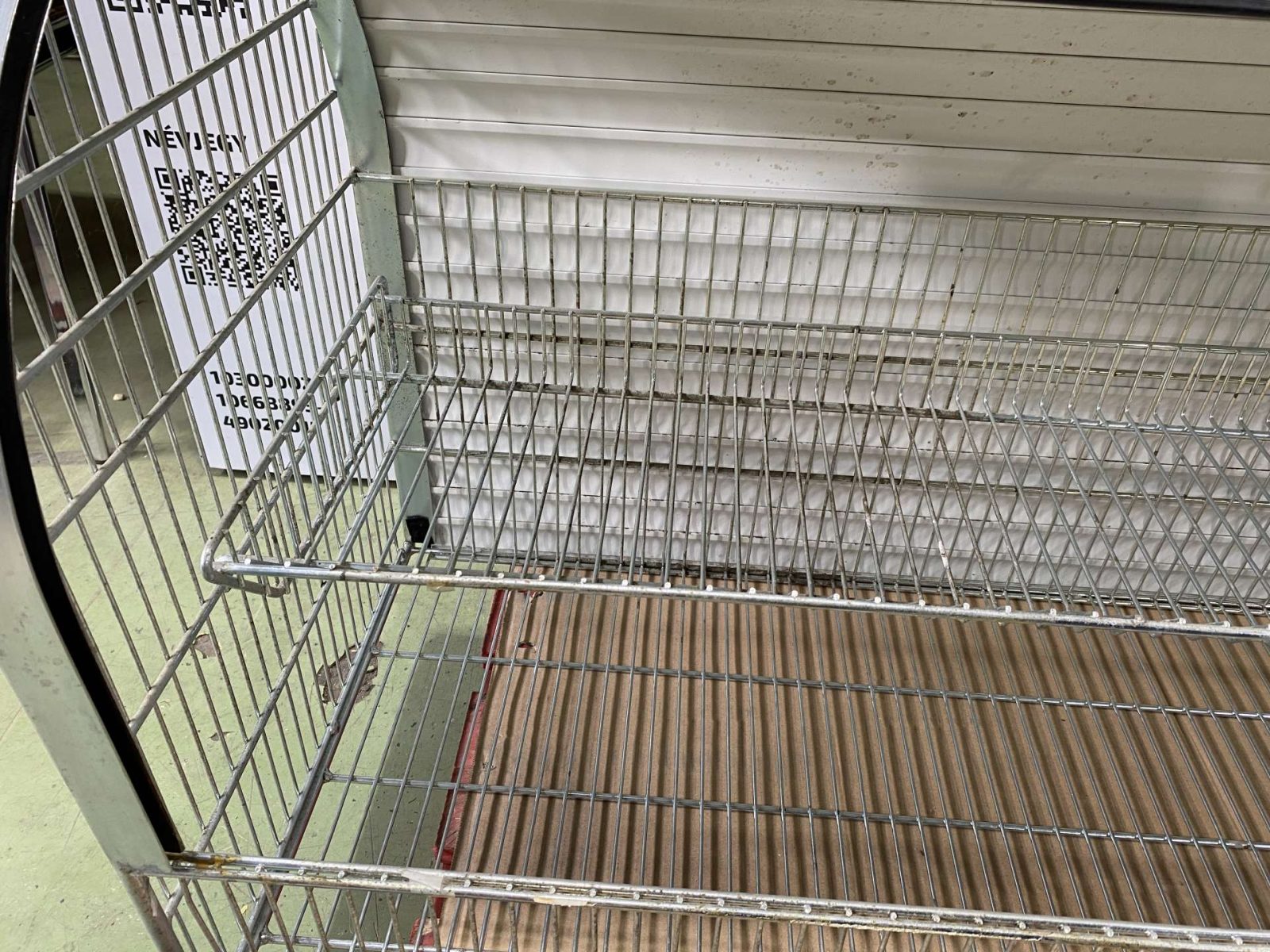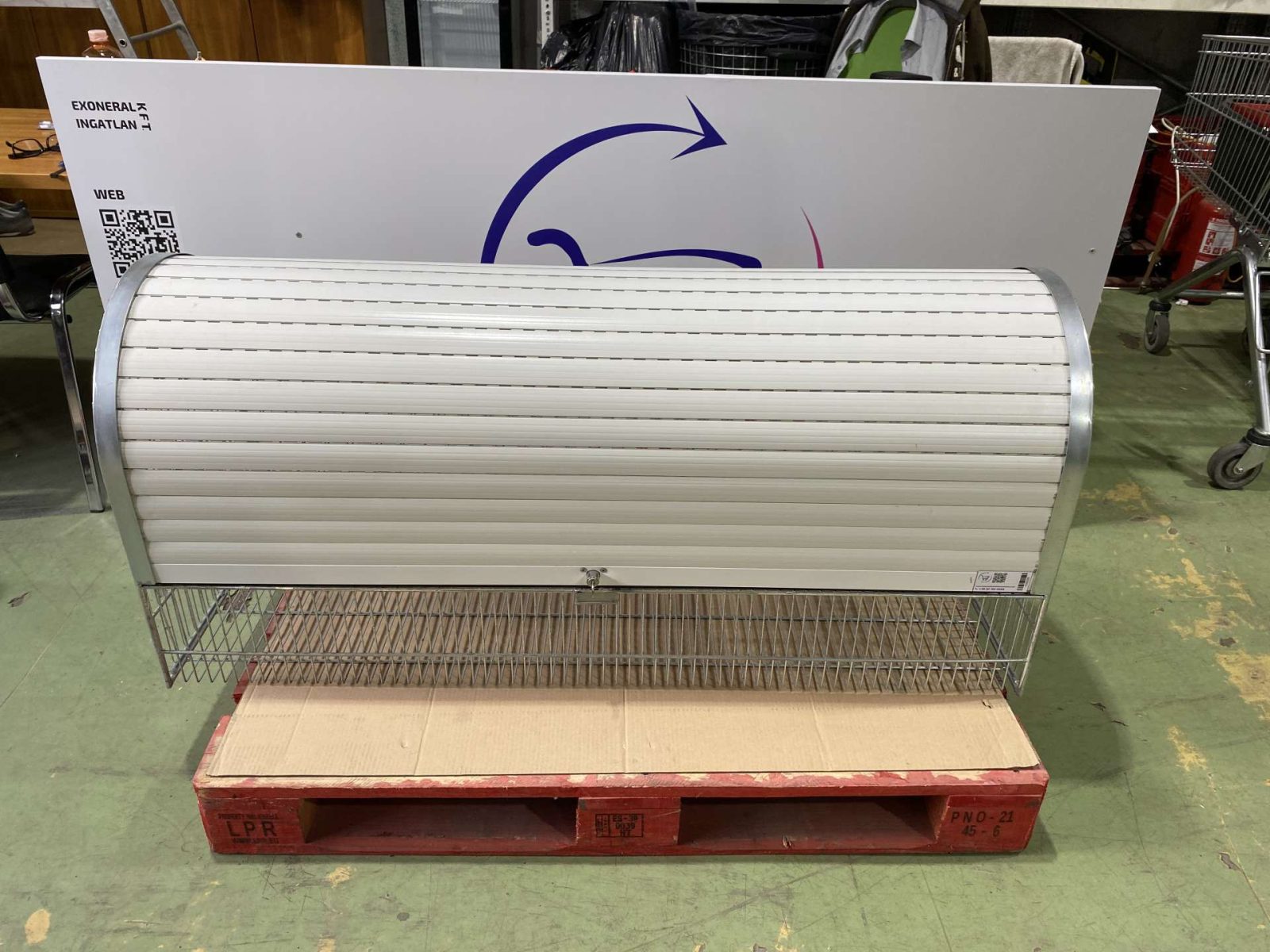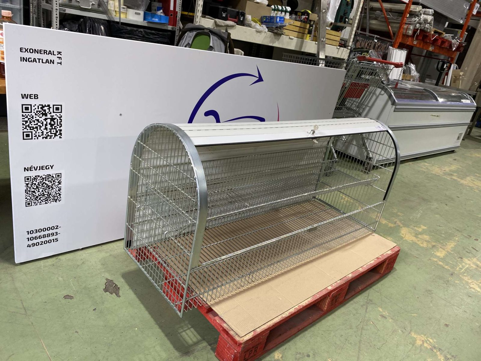 Horganyzott váz és állítható kivehető köztes rácspolc. A búror kasszaállványra, vagy polcra, helyezhető. Műanyag redőny tökéletes állapotban van, de a zár nem működik rajta.