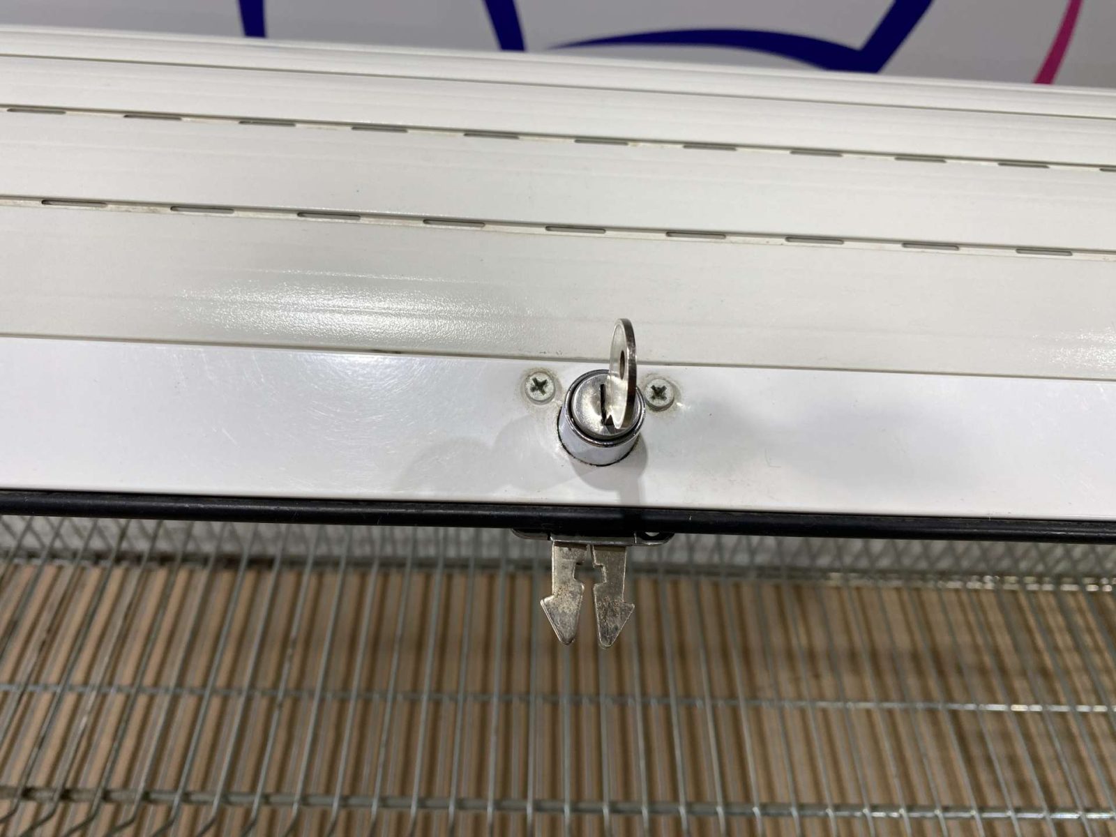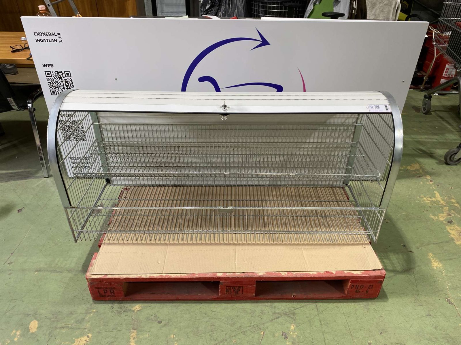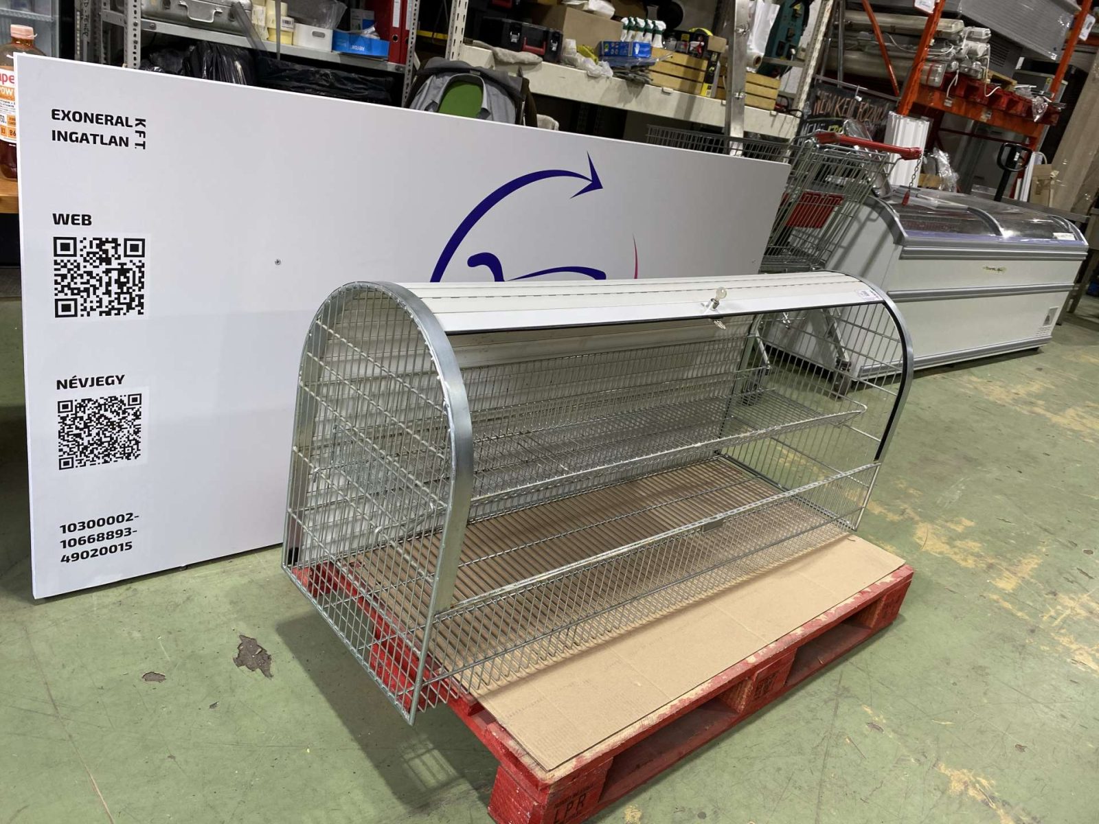 Horganyzott váz és állítható kivehető köztes rácspolc. A búror kasszaállványra, vagy polcra, helyezhető. Műanyag redőny tökéletes állapotban van, de a zár nem működik rajta.