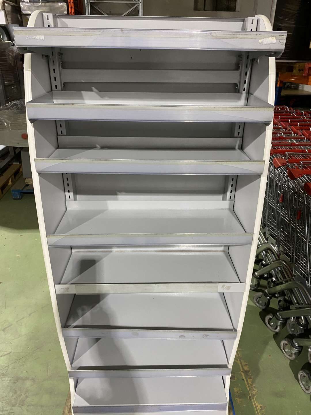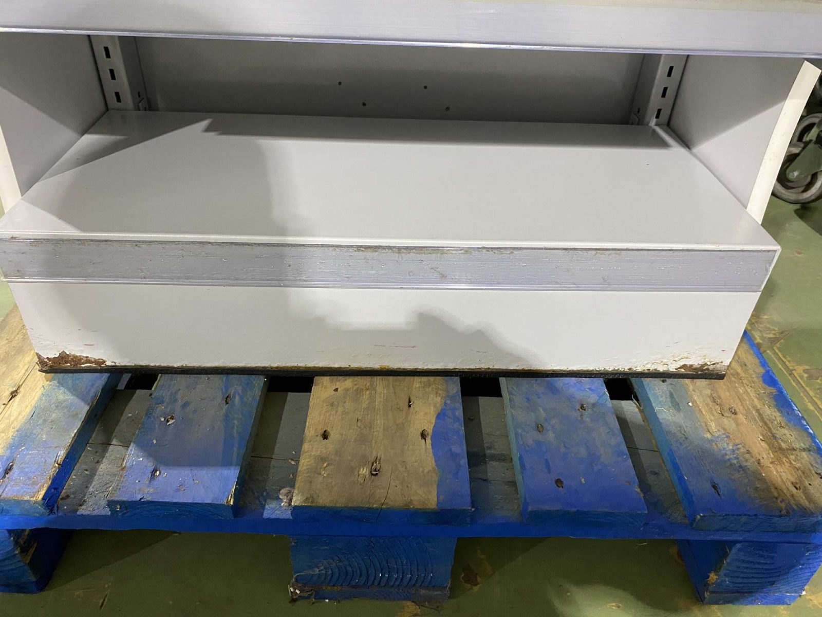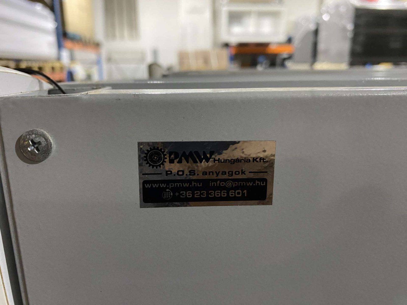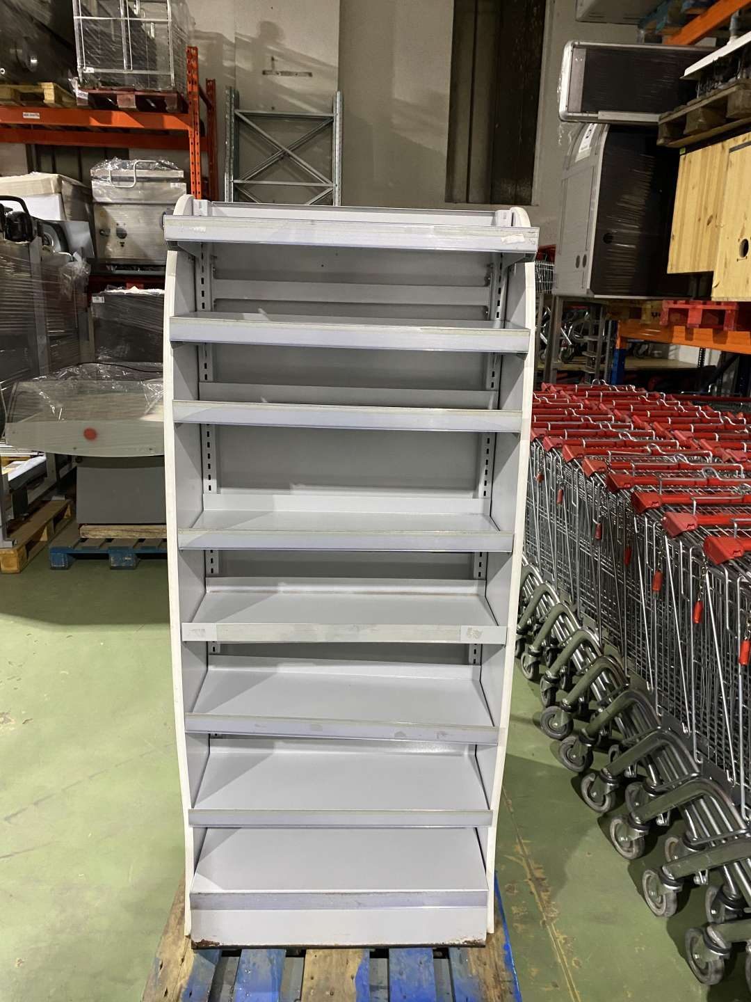 Fém állvány alap+ 7 sor állítható fém polccal. Polcméret: 60*25 cm. Az élzárt bútorlap oldalfalak egyedi igények szerint átmatricázhatóak. Lábtakarólemezeken - javítható- rozsdafoltok.