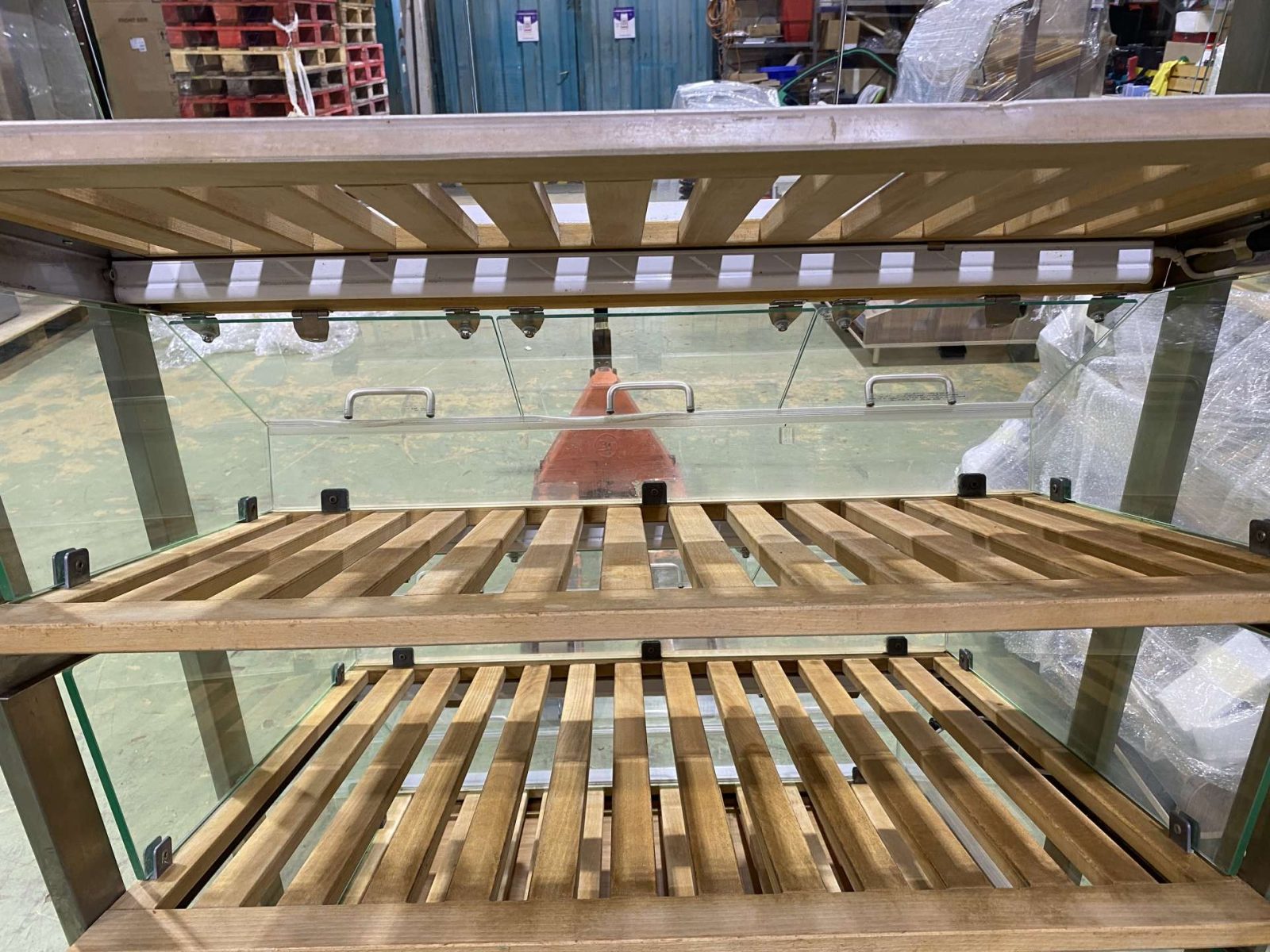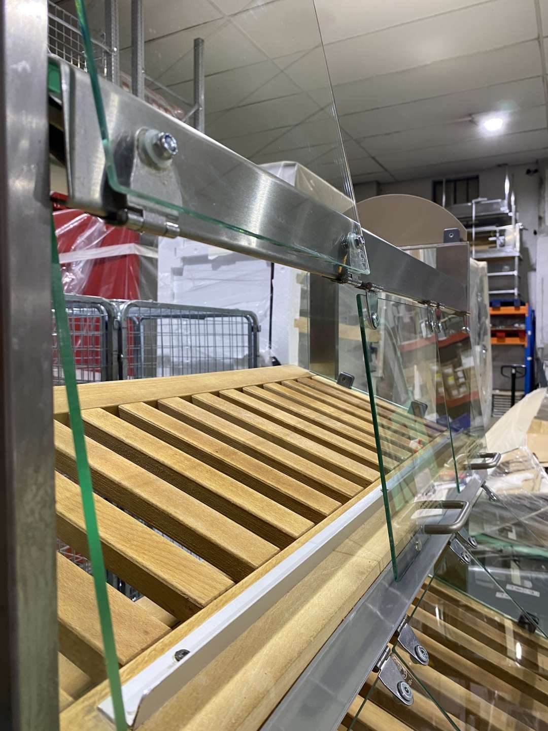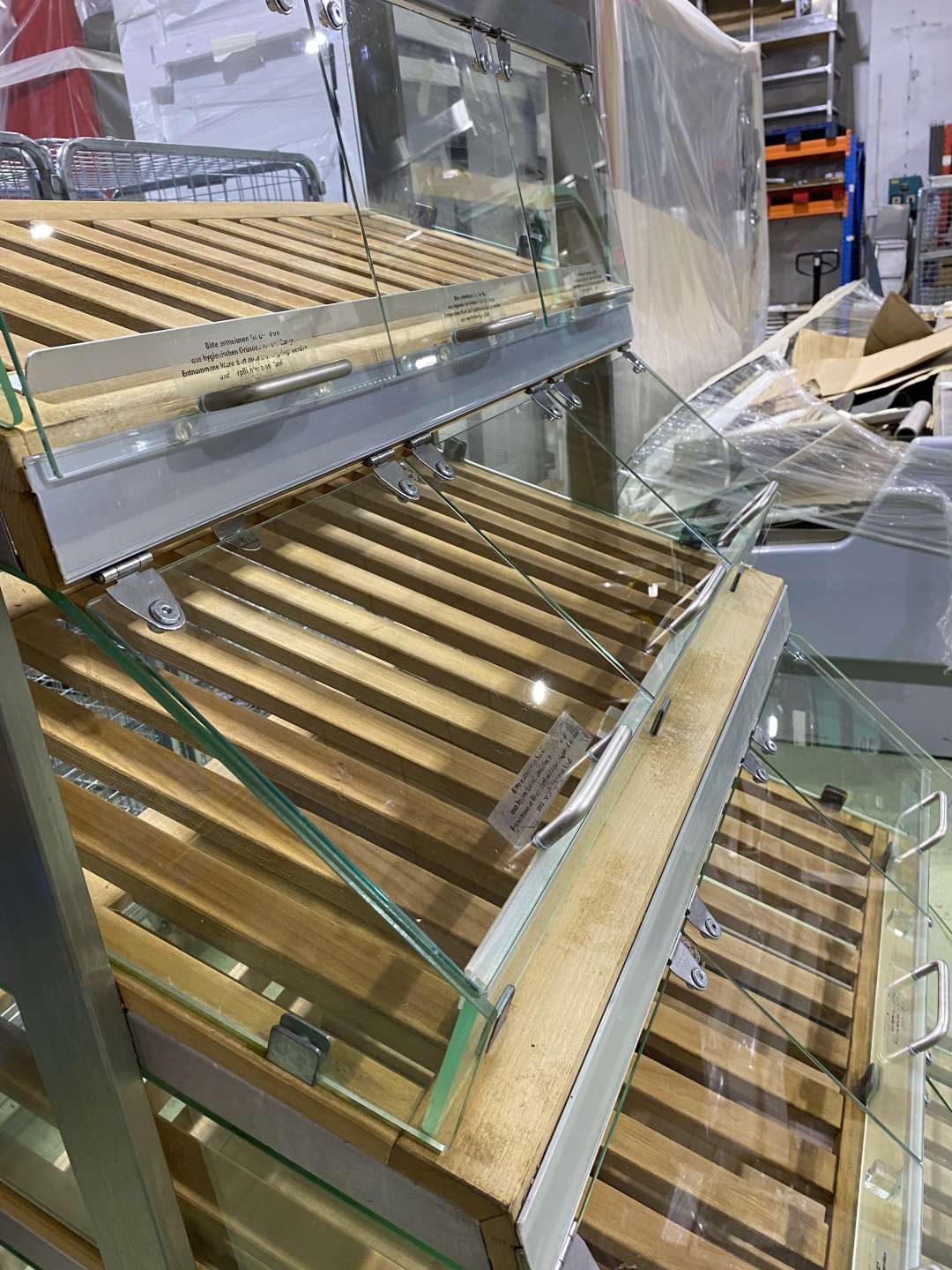 Német import fimompékáru adagoló, kínáló. Masszív rozsdamentes vázon üveglapos zárás felnyitható leheletvédővel. Igényes, higiénikus pákárubemutatás. 10 cm-es lábakra szerelt, így könnyen mozgatható, szállítható. Szintenkénti beépített világítással.
