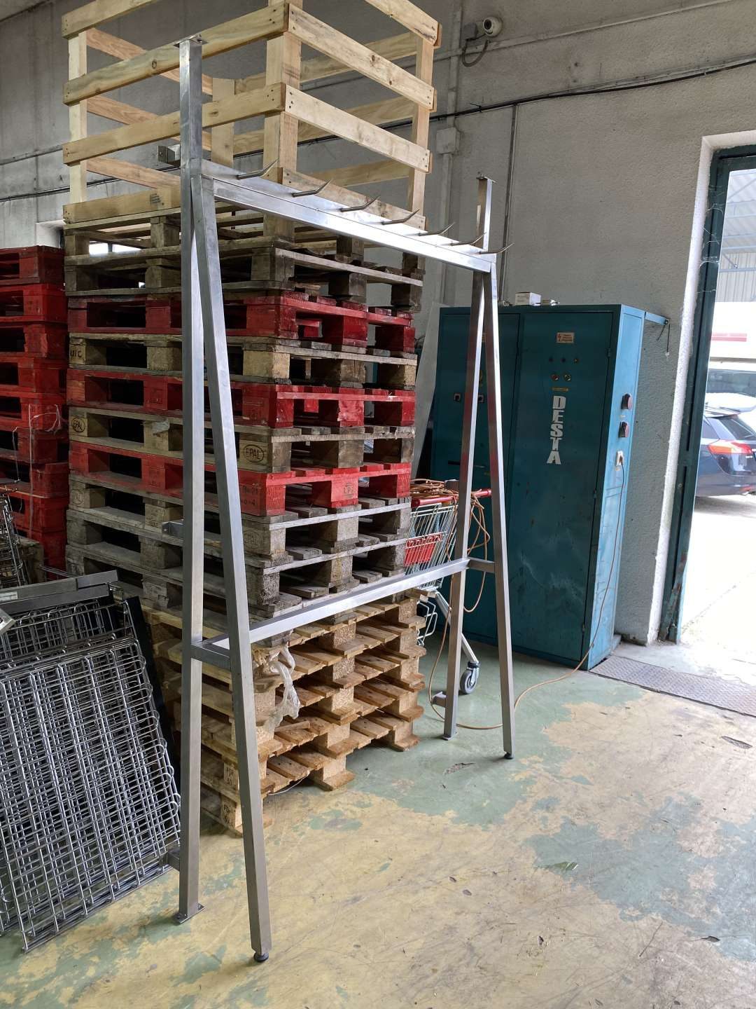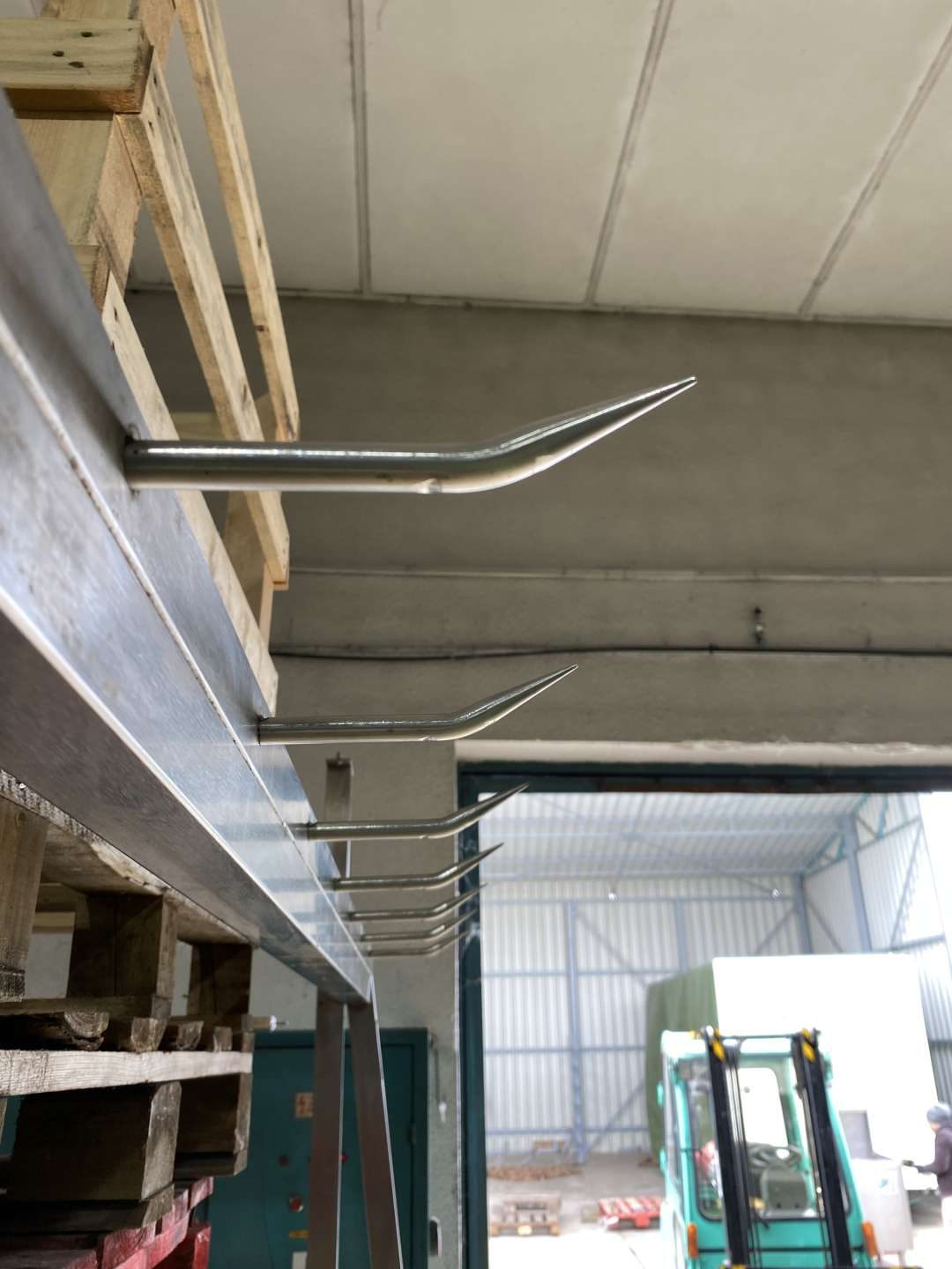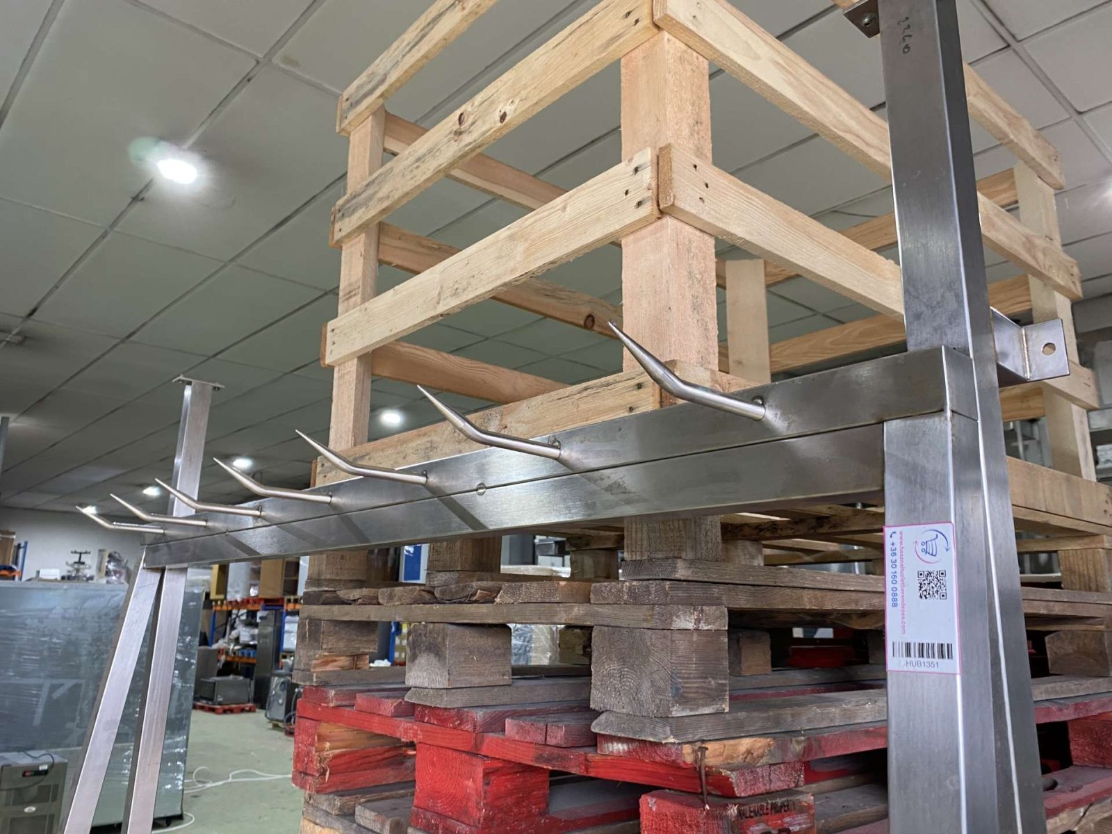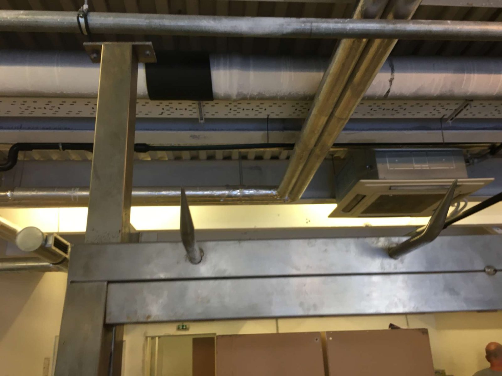 A kampók felfele hajló hegyes kampók félsertés, negyed marha tárolásához kialakítva.