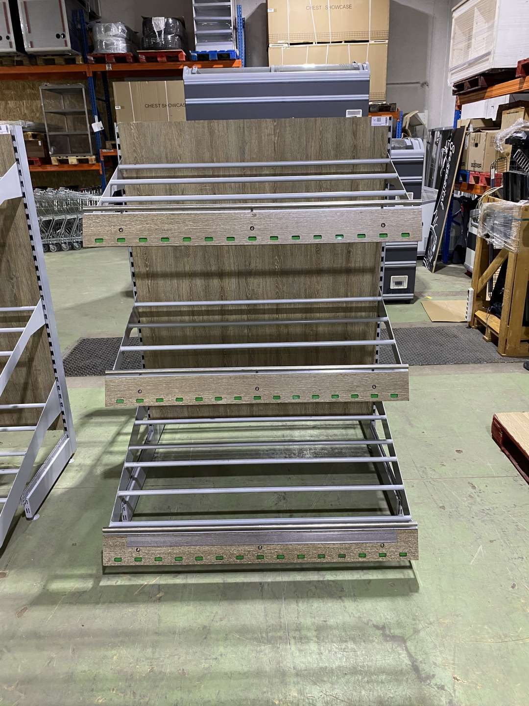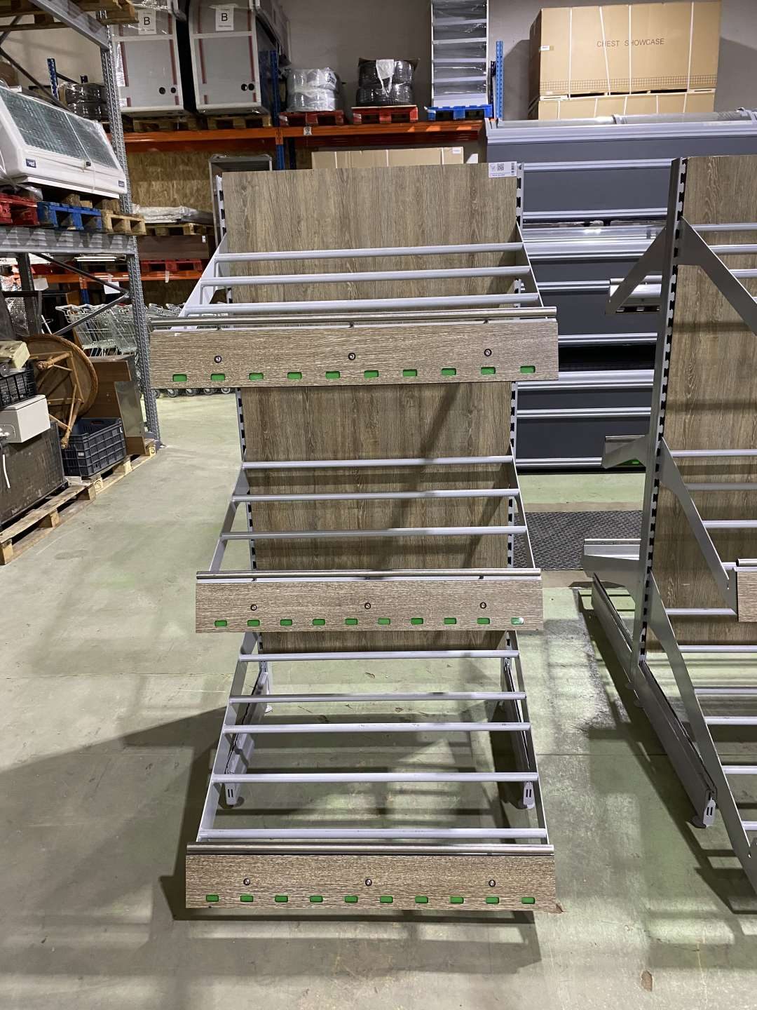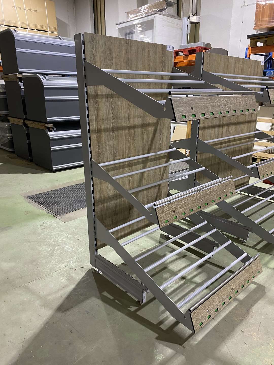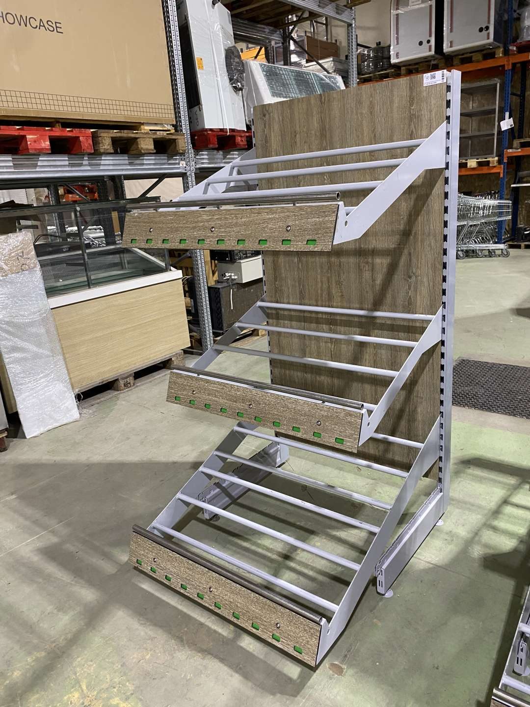 TEGO vázra szerelt zöldséges regál, 80-as tag 3 darab döntött ládatartó polc, 4 darab M10-es rekesz bemutatására alkalmas. Lanti árak kosarak és árkijelzők nélkül értendőek.