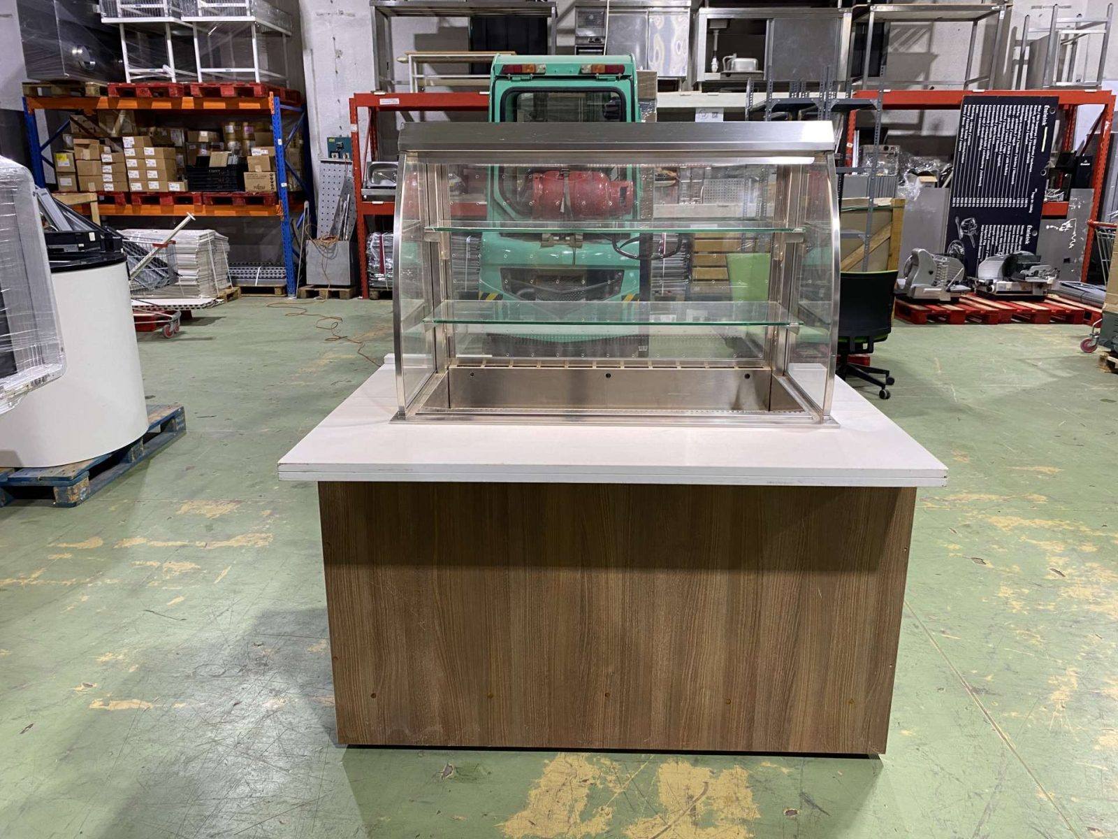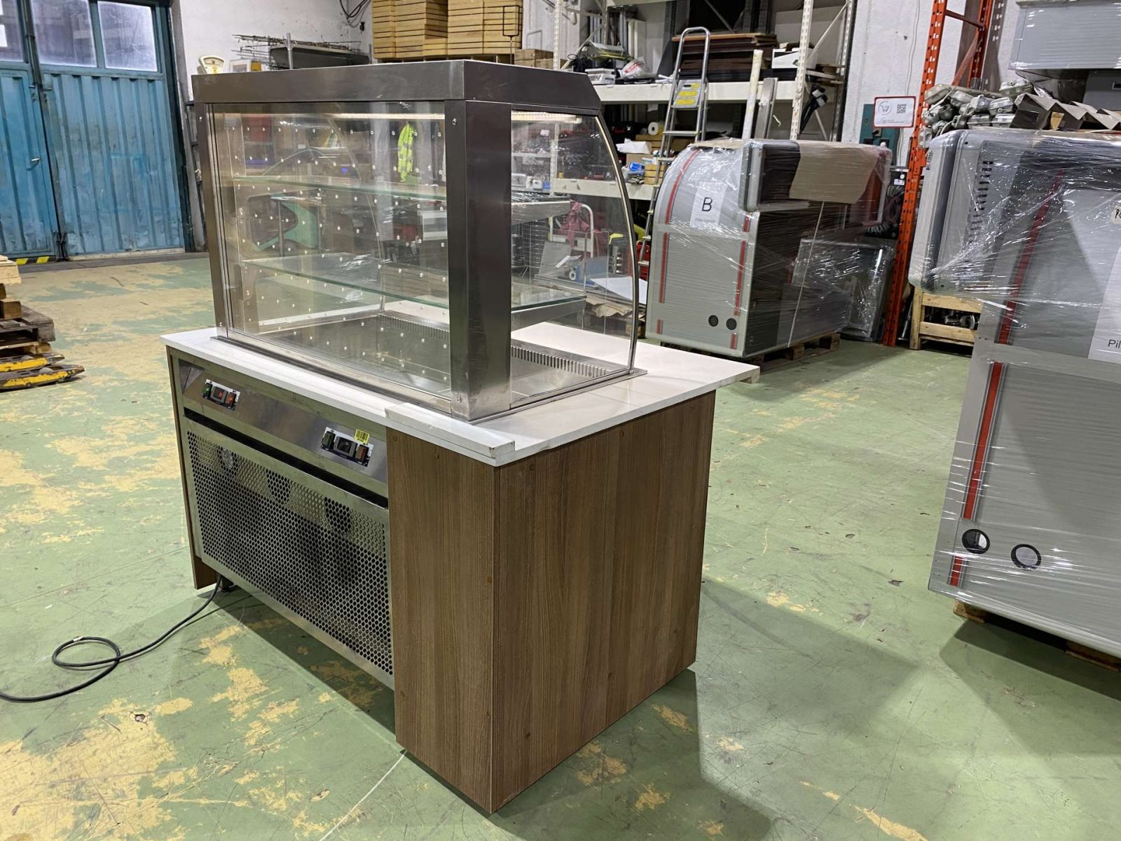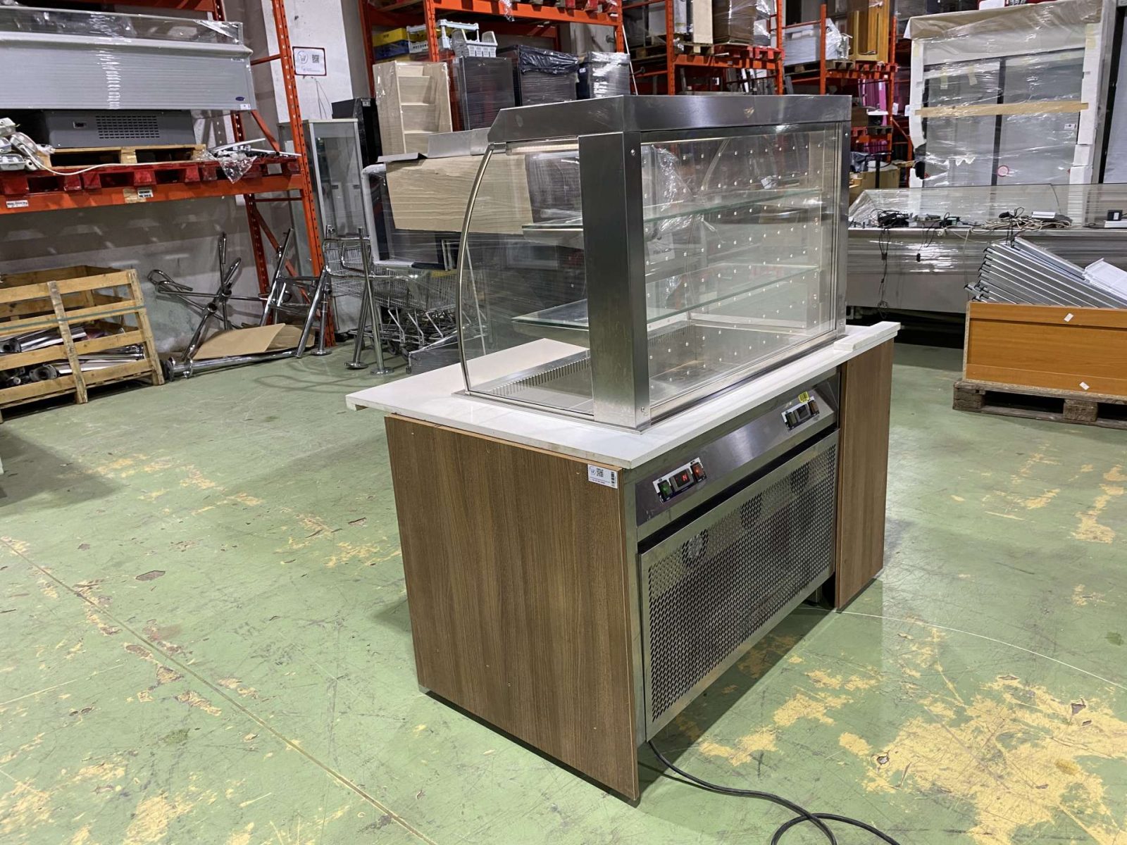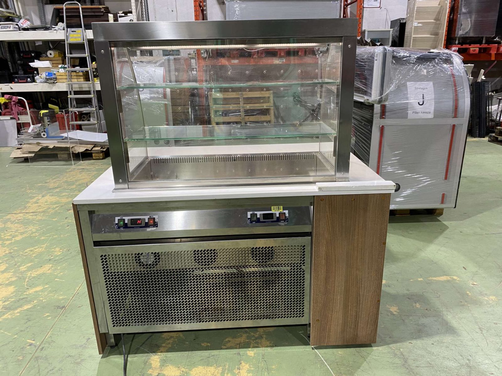 Hűtött medencés vitrin exkluzív pultba építve. H=160. Az ár magában foglalja a rozsdamentes asztalvázat, a fehér Technistone műkő fedlapot, a vitrint és a vitrin gépészetét. Igény szerint fronburkolatot is adjuk. A berendezés három oldalról zárt (üveg oldalfalak, plexi hátfal) elöl nyitott. Automaitkus leolvasztással, digitális hőmérsékletkijelzéssel, 3 szintes, beépített világítással, hűtési tartomány: +3/+8 C. Üzemképesen, letakarítva kerül átadasra.