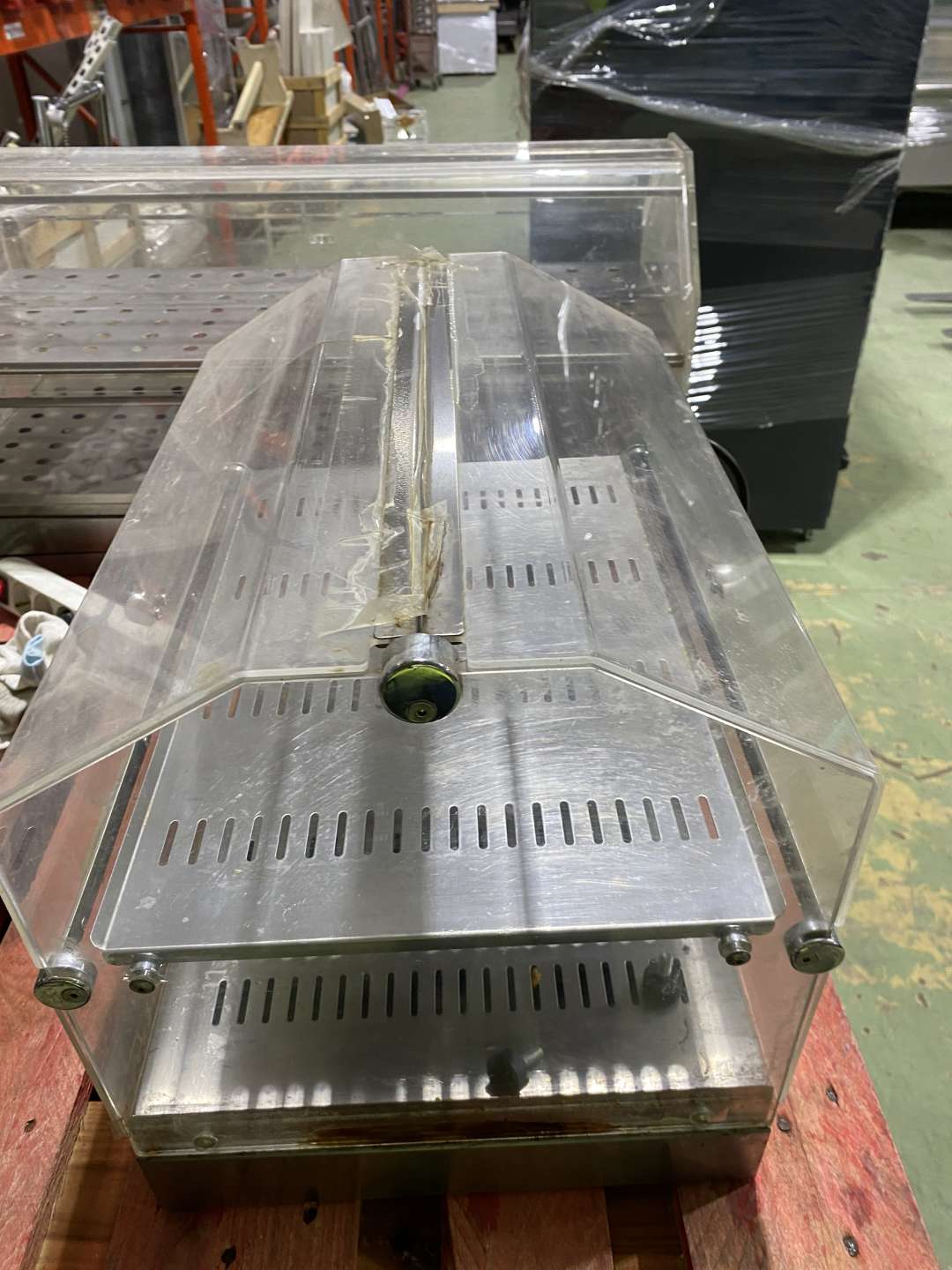Vitrinplexi, a tetőrészen egyhén sérült, ragasztott. Felnyitható plexiajtóval és inox tálcával.