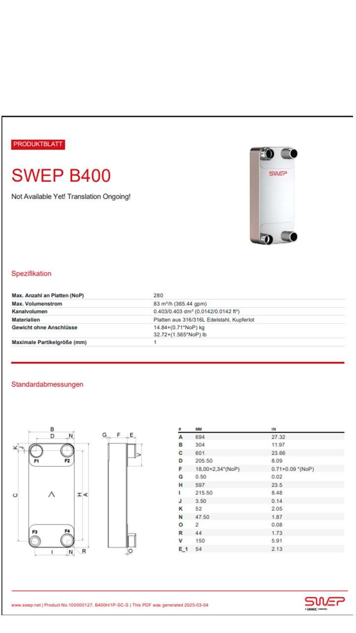 Swep lemezes hőcserélő típus: B400THx130/1P-SC-M 42U+54.3+2x3 /2x3"