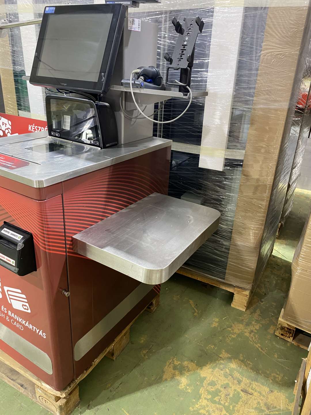 Laurel önkiszolgáló kassza. 2020-as gyártás és 2020.10. havi beüzemelés. NCR szkenner, beépített Bizerba SC300-as mérleggel, Posiflex érintőképernyős monitorral, bankkártya és készpénz fizetési lehetőséggel. ( BNR MMA B2-UB bankjegykezelő) Kézi szkenner és pin pad tartó.