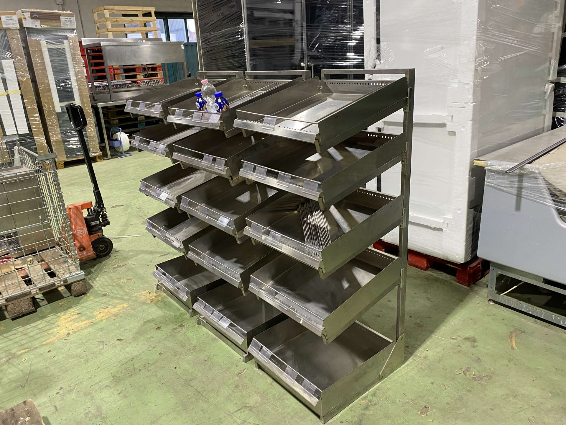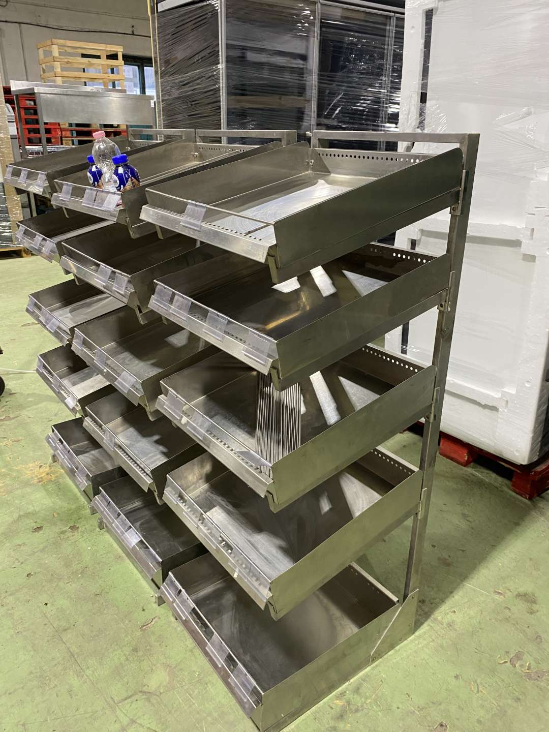 Különleges egyedi állvány, döntött, állítható polcokkal és osztópálcákkal. Az állítható polcok oldalainak magassága különböző, tökéletesen illeszkedik minden palack, illetve dobozmérethez. Állványonként 5 sor polc és 15 darab osztópálca. Méretek: 50*57*140cm. ( Szélesség*mélység*magasság) 2 darab raktáron.