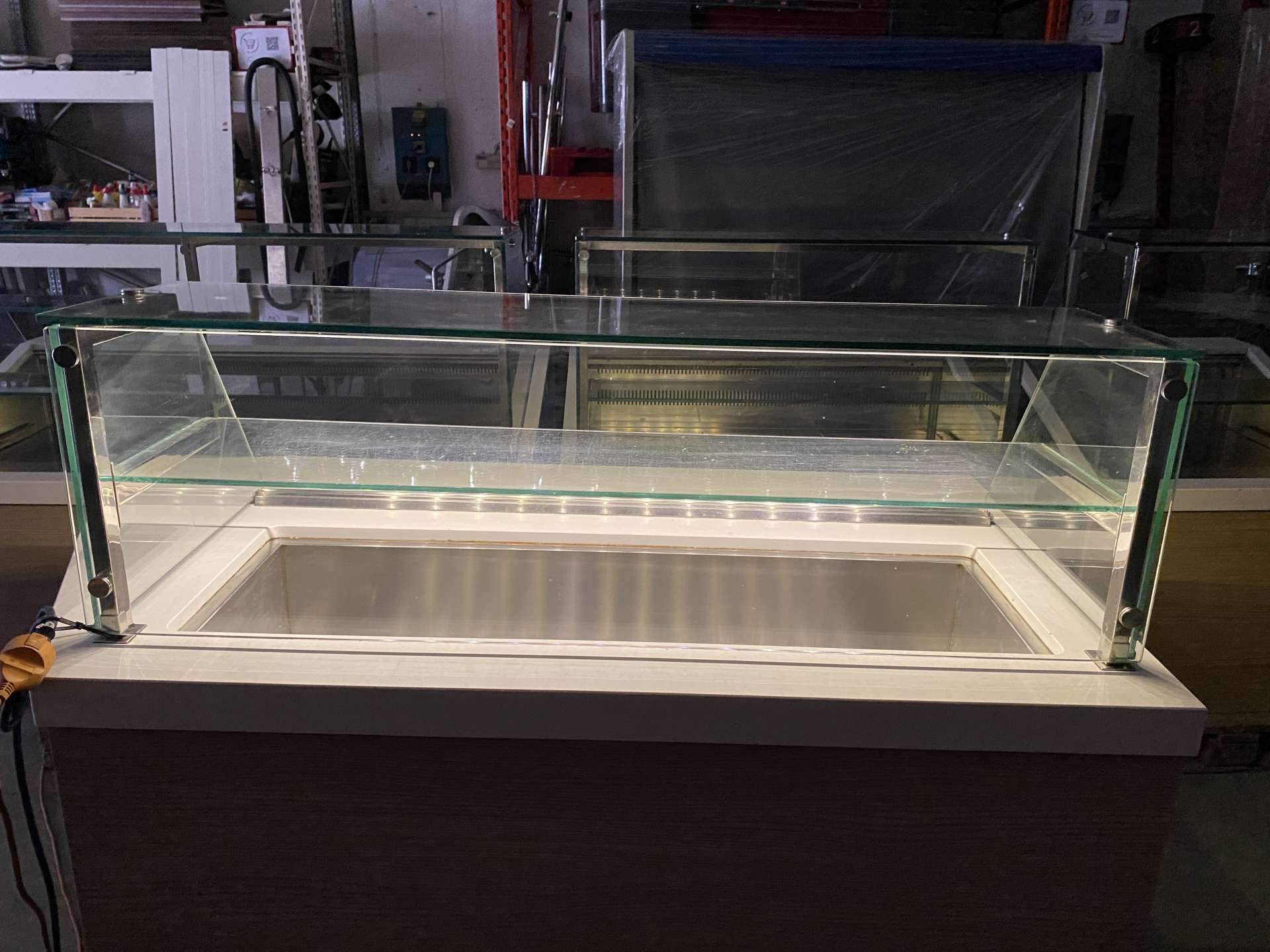 (Cikkszám 2699) Hűtött ( GN edény kompatibilis) medence háromoldali leheletvédővel, beépített hűtéssel. Bútor jobboldala asszimetrikus. (Lsd. fotók!) Bútor mérete: 160/128*80*127cm. (Szélesség*mélység*magasság) Húzott hűtött medence méretei: 104/108,5*30*15cm (Szélesség*mélység*magasság)