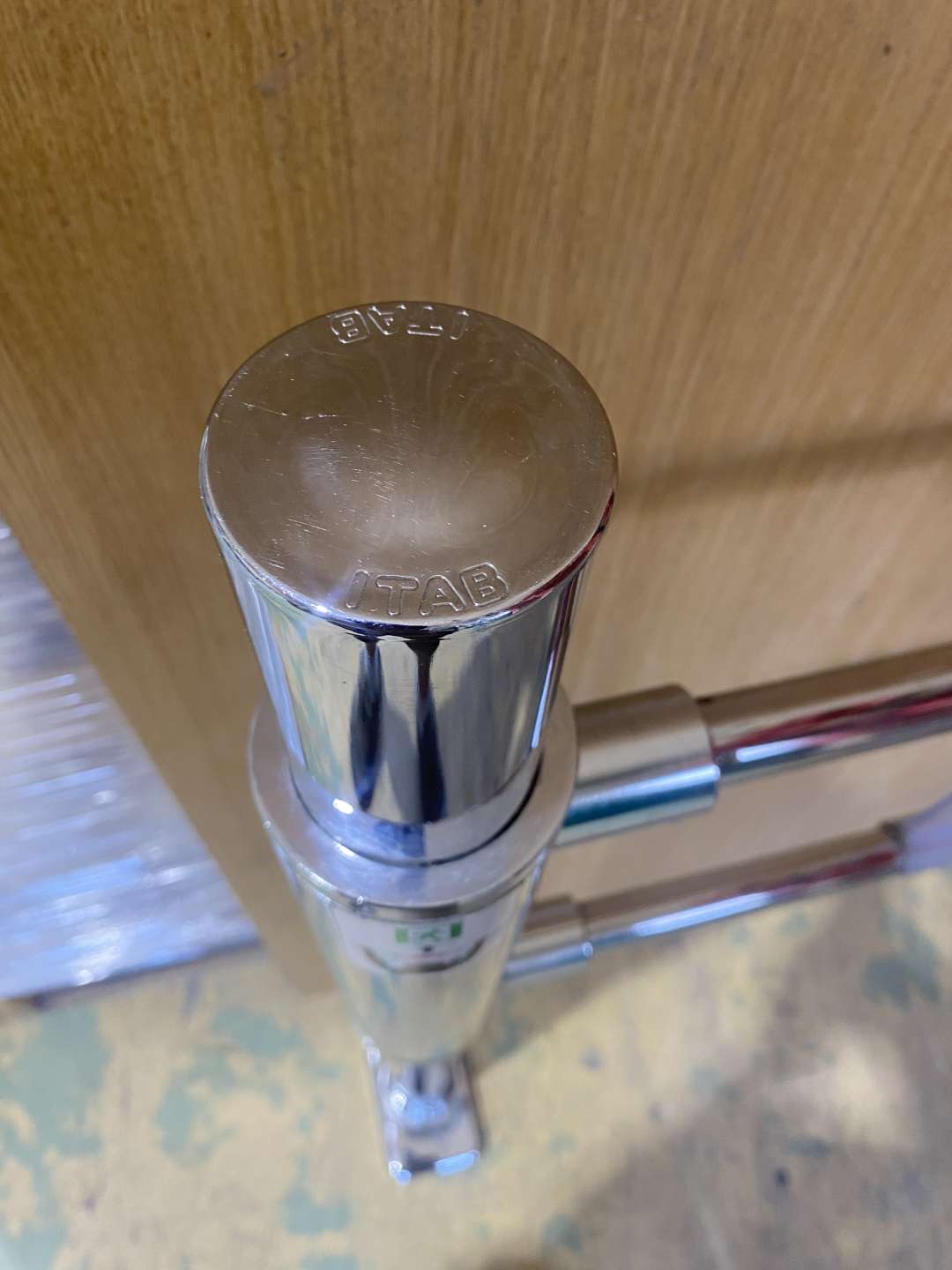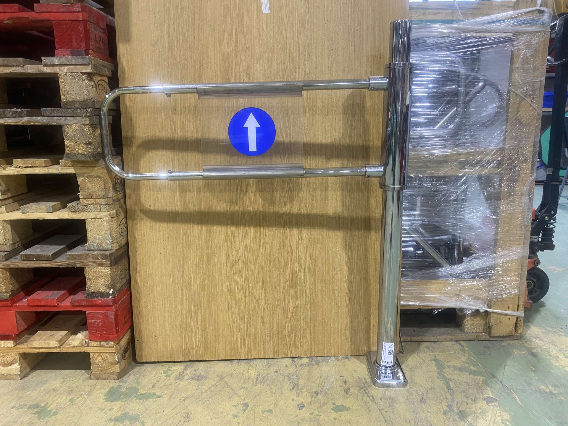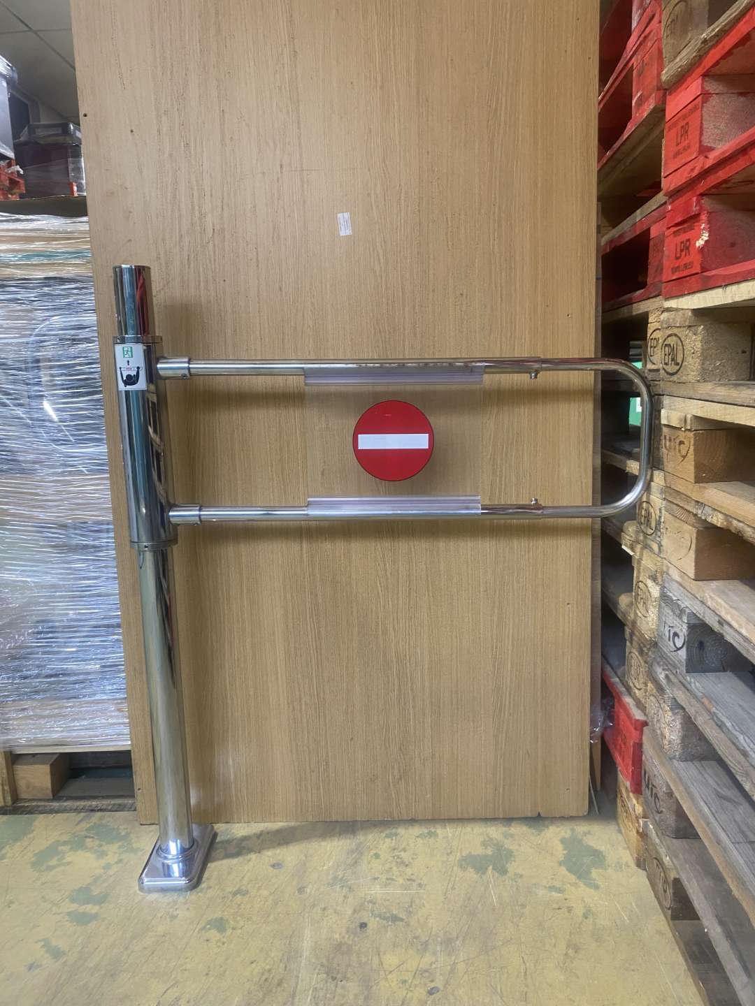 Egykaros CP króm mechanikus vevőbeengedő kapu. 90 cm széles, 108 cm magas oszloppal. Padlóhoz rögzíthető. Nyitókar összetolható, így a szélessége ~ 15 cm-el csökkenthető.