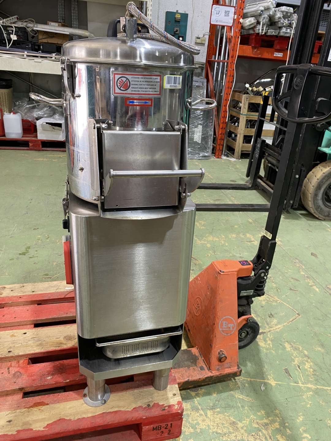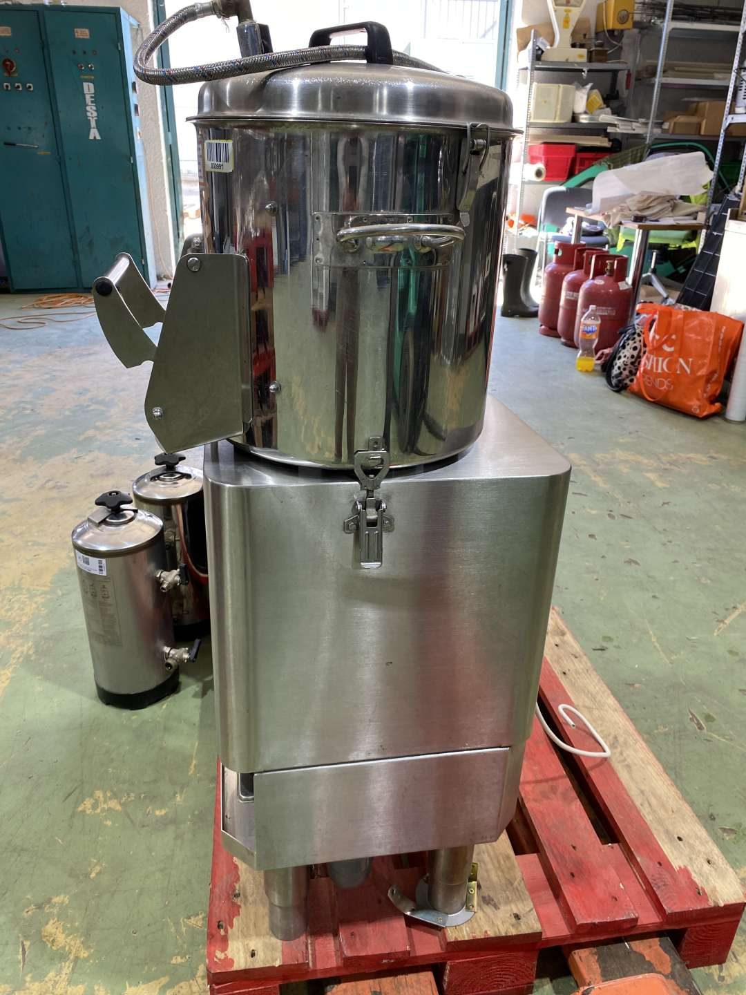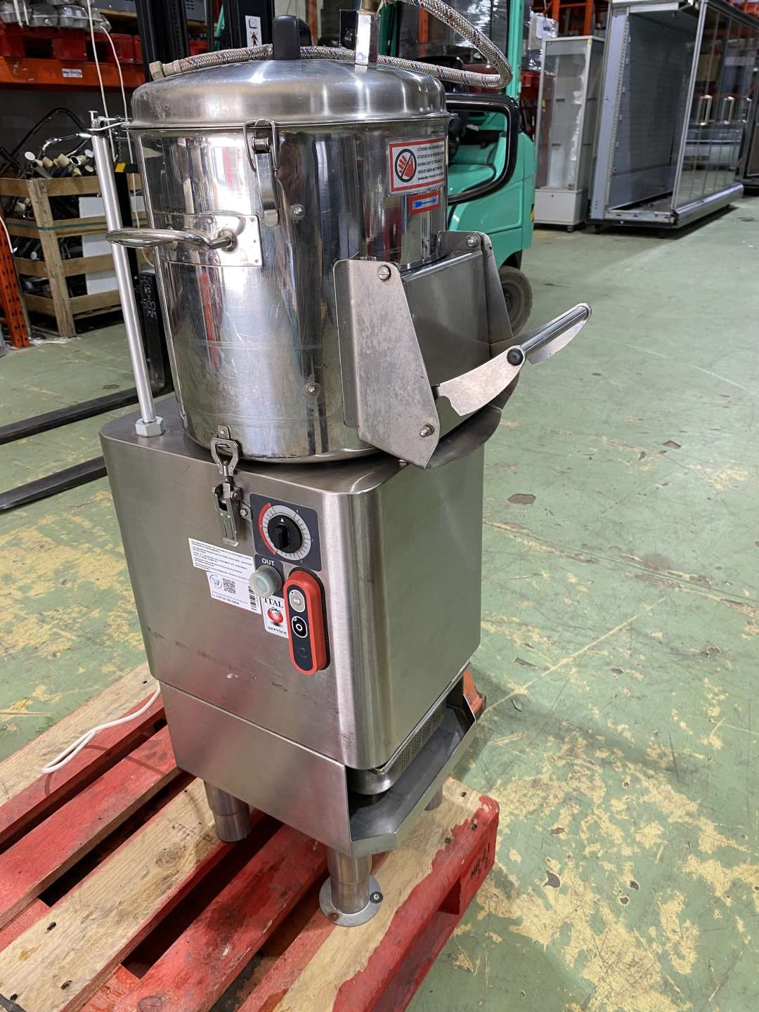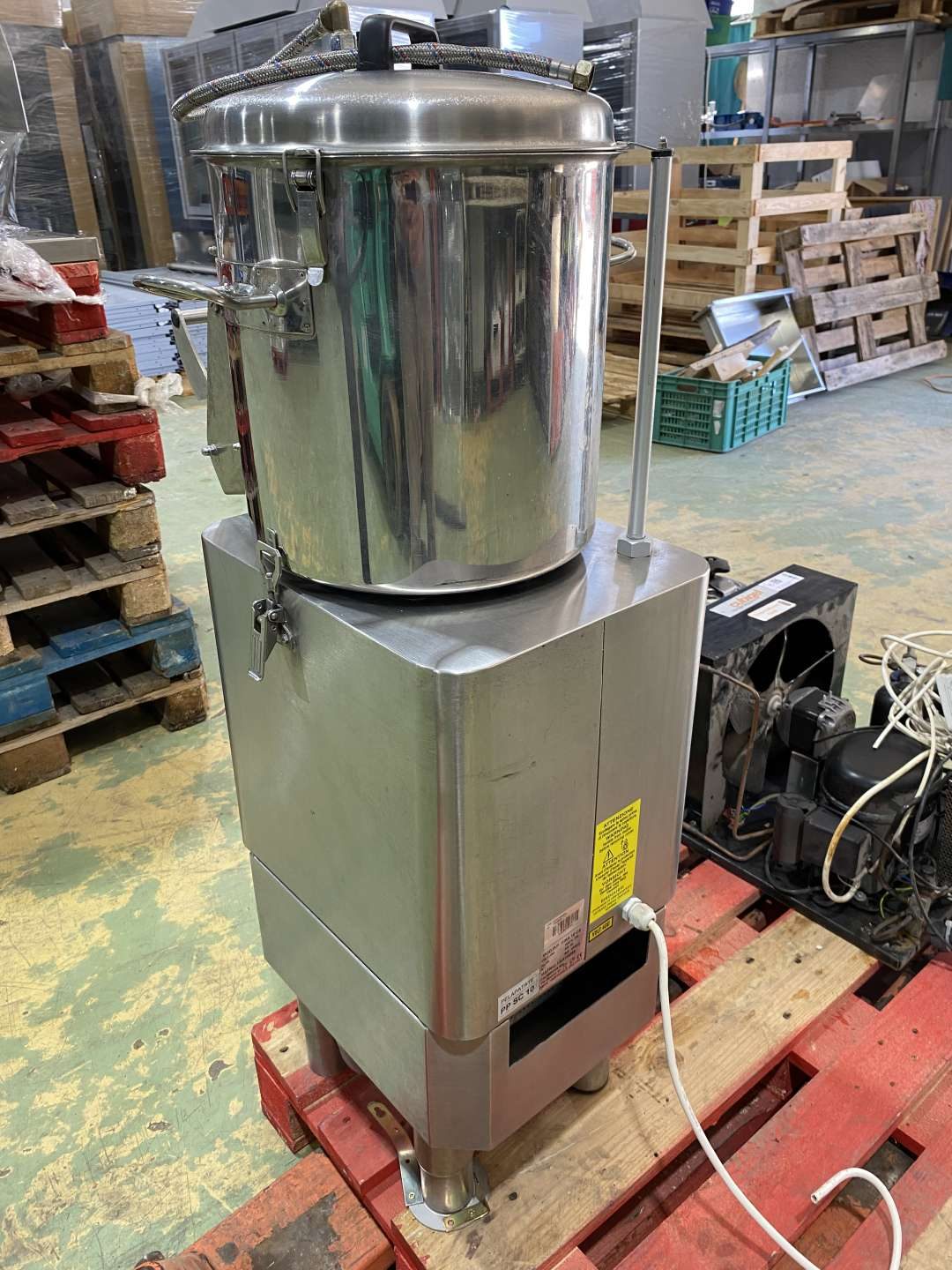 Burgonyakoptató gép, rozsdamentes acélból. Kapacitás: 10-12kg. Mikrokapcsolóval a fedélen és az ajtón. A töltőnyílások fede biztonsági reteszeléssel ellátott. A koptatóelemek egyszerűen cserélhetőek. Hidegvíz csatlakozás: 1/2". Csatorna csatlakozás: átm.40mm. Kiemelhető iszapfogó betéttel. Ajtótömítést cserélni kell.