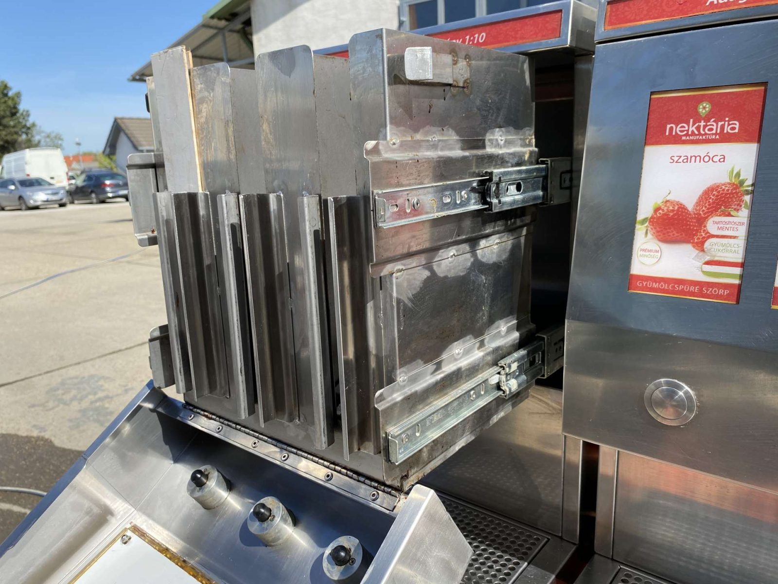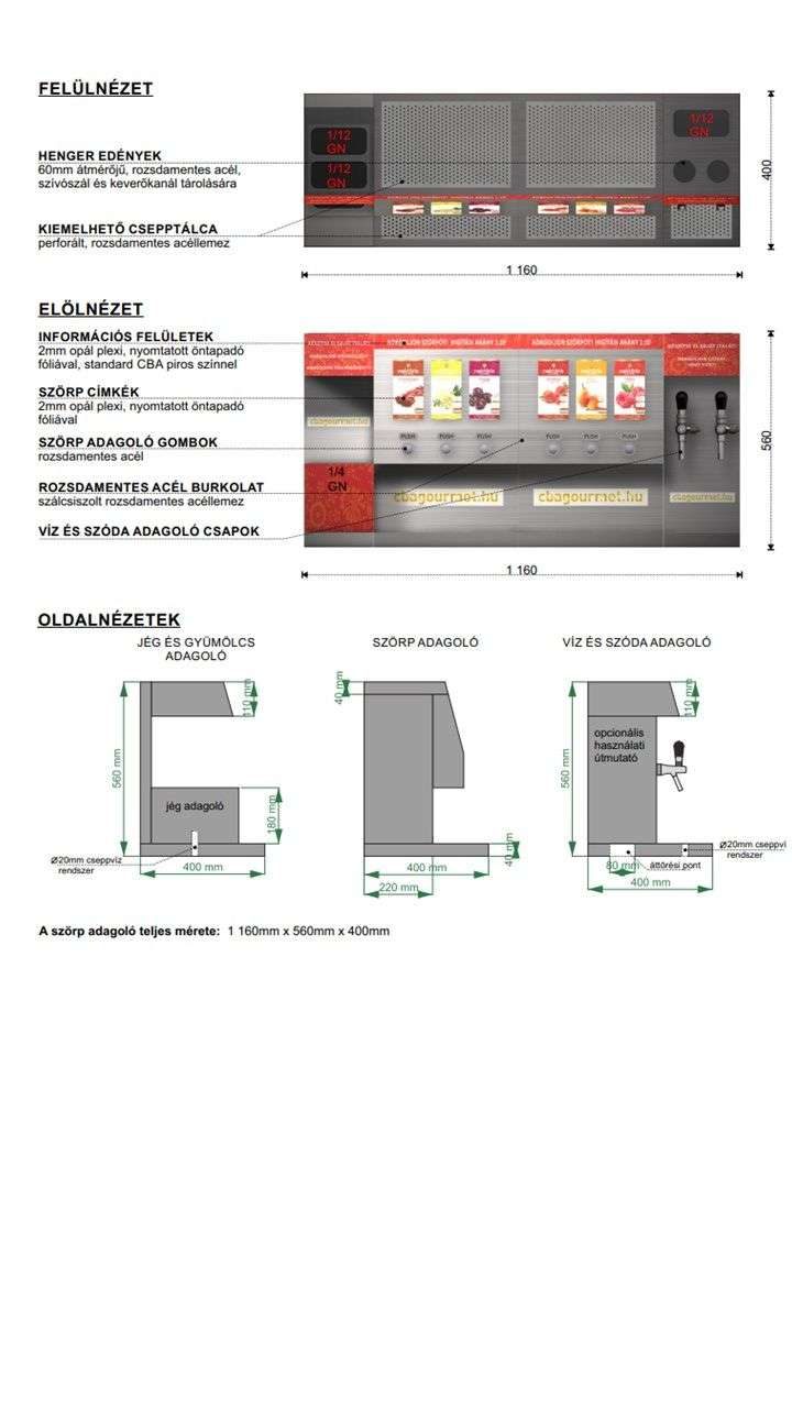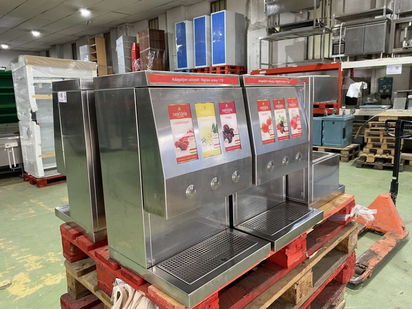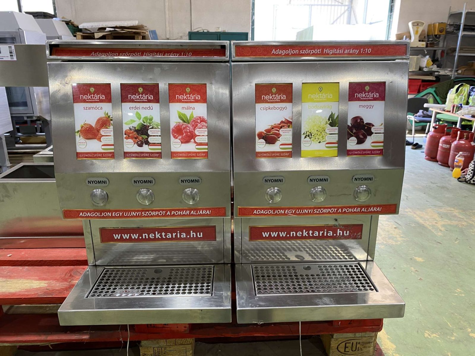 Gravitációs rendszerű szörpadagoló berendezés. 4 darab gép készleten, minden berendezésbe 3 bag in box zsák helyezhető el. Mechanikus adagolás, mely törtéhet kiszolgáló és önkiszolgáló rendszerben. Branding igény szerint változtatható, minden felirat cserélhető. 100% rozsdamentes kivtel. Asztalra helyezhető, a cseppvízelvezető csonk csatornába beköthető. Kemelhető rozsdamentes tálcákkal. Külön hirdetésben gyümölcs és jégtartó.