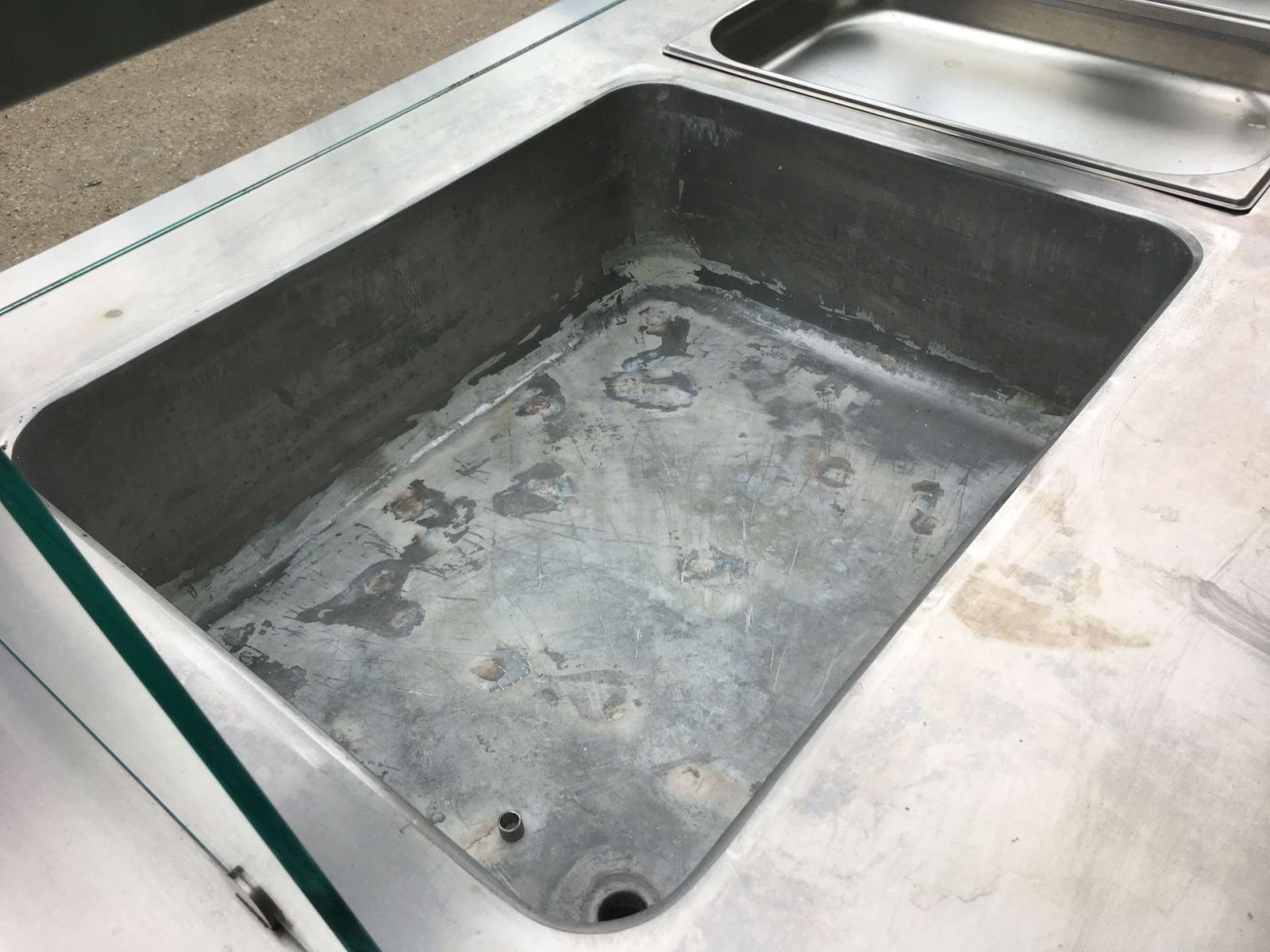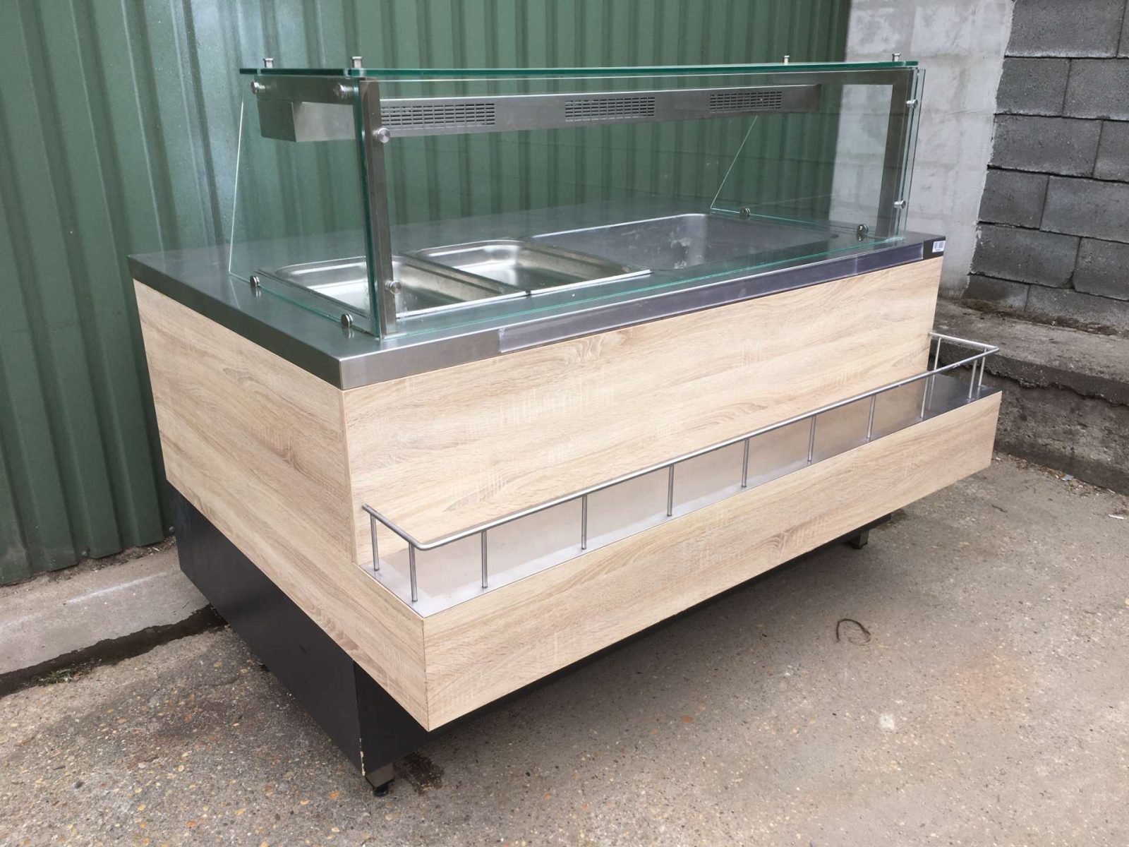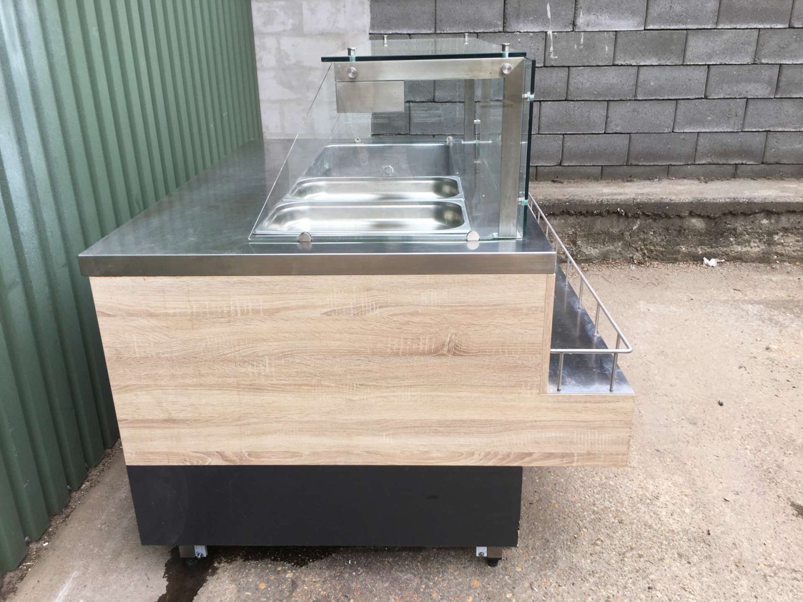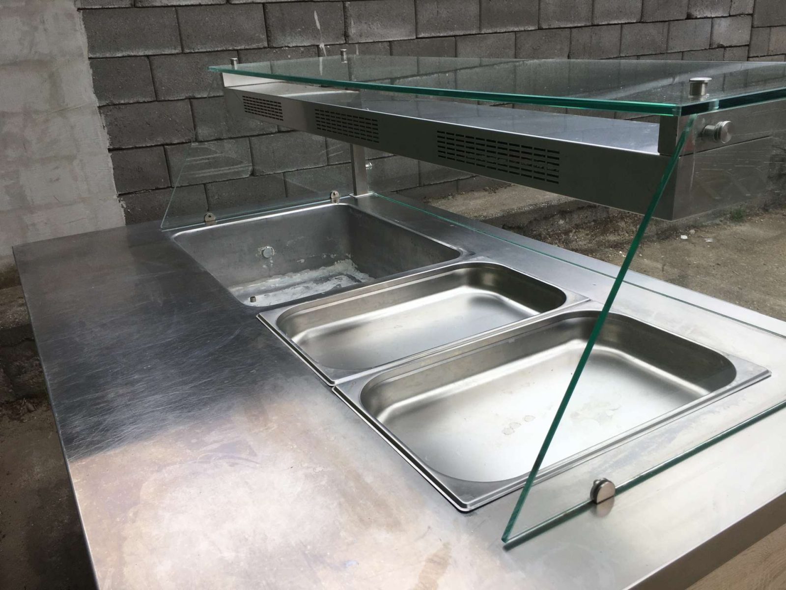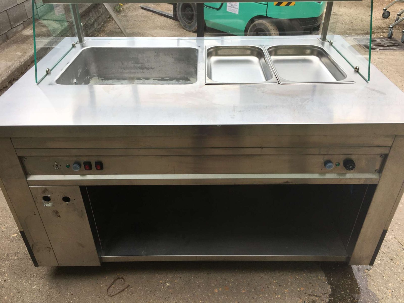 Egyedi bútor, 4 darab GN 1/1-es ( vagy ennél arányosan több kisebb méretű) GN edény helyezhető el benne. Vízkőtelenítve, letakarítva. Feltöltő,- és a leengedőcső víz,- csatornahálózatra ráköthető. Egy hőfokállító gomb hiányzik, pótolható. Hőfokállítás e-nélkül is lehetséges.