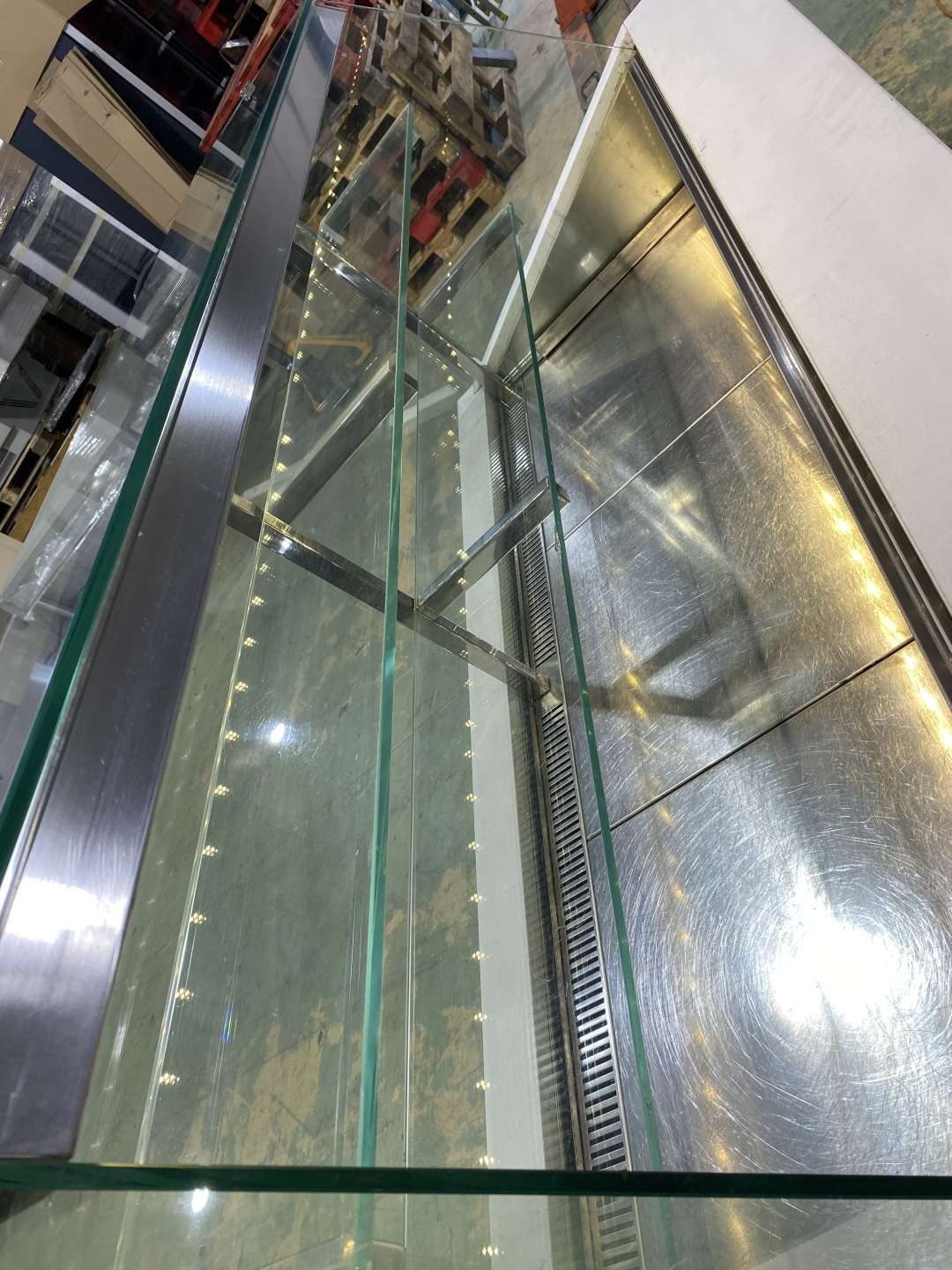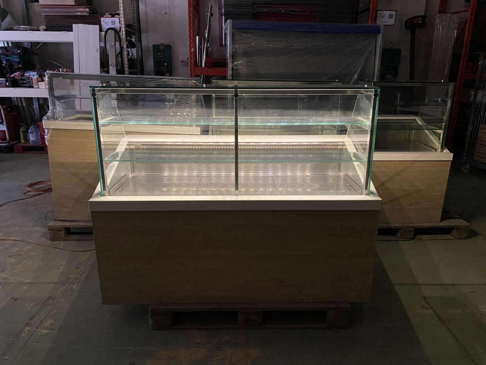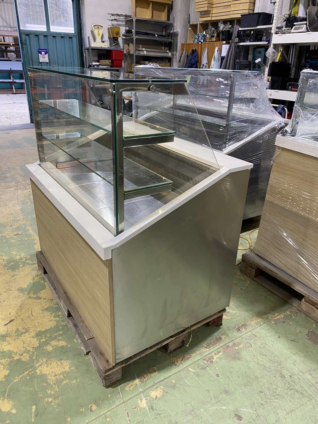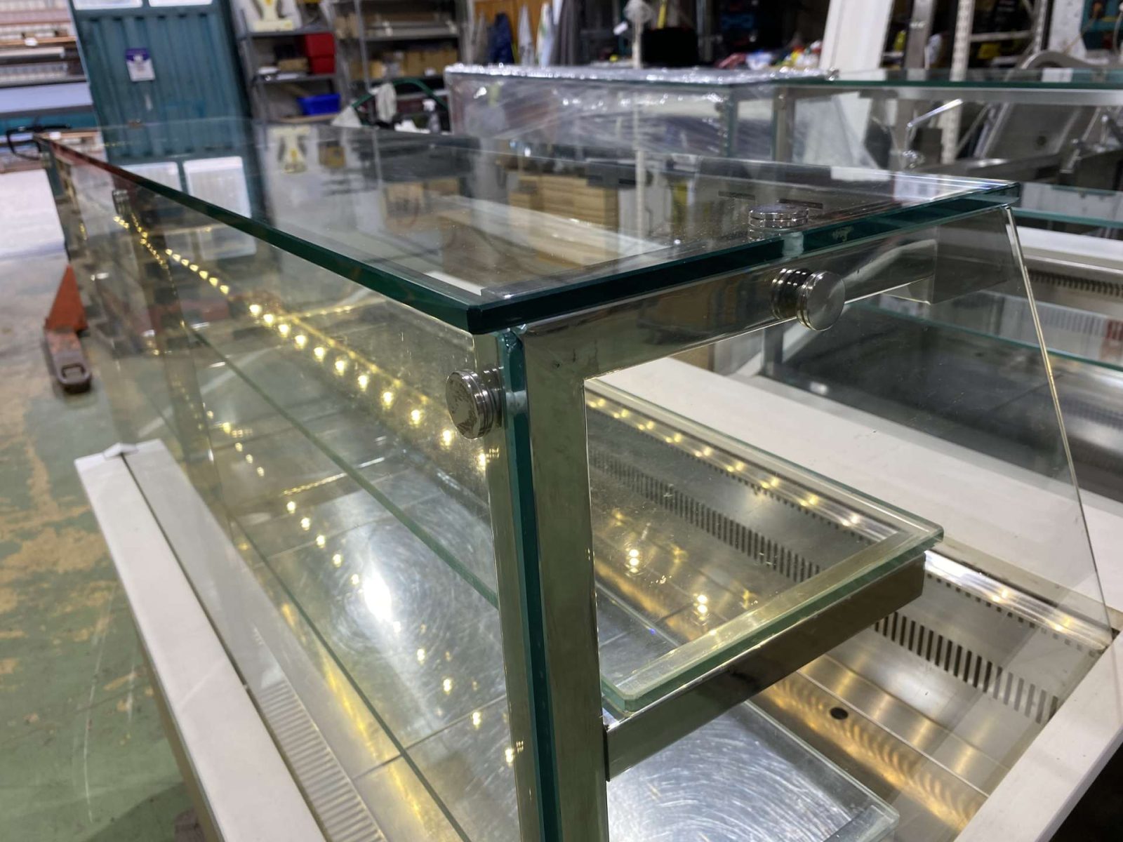Cikkszám 2700) Hűtött vitrin alsó medencével és kettő darab üvegpolccal, valamint háromoldali leheletvédővel, beépített hűtéssel. Bútor mérete: 120*80*127cm. (Szélesség*mélység*magasság)